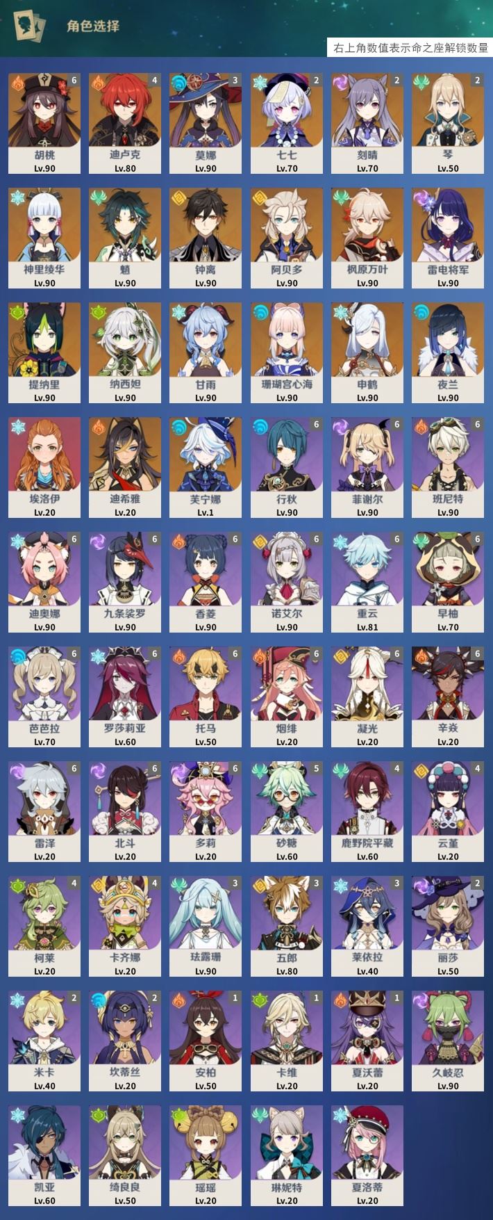 【终身找回包赔】【IPPM72CEB】60级,53黄,女主,21个五星角色:满命胡桃,4命迪卢克,3命莫娜,2命七七,2命刻晴,2命琴,神里绫华,魈,钟离,阿贝多,枫原万叶,雷电将军,提纳里,纳西妲,