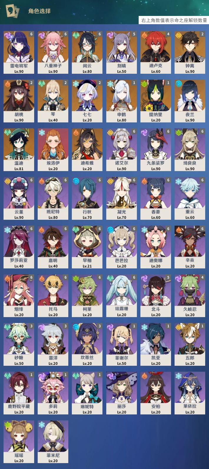 【终身找回包赔】【IPPM7HC2D】59级,70黄,女主,15个五星角色:满命雷电将军,满命八重神子,满命闲云,5命刻晴,4命迪卢克,2命钟离,2命胡桃,2命琴,2命七七,1命申鹤,1命提纳里,夜兰