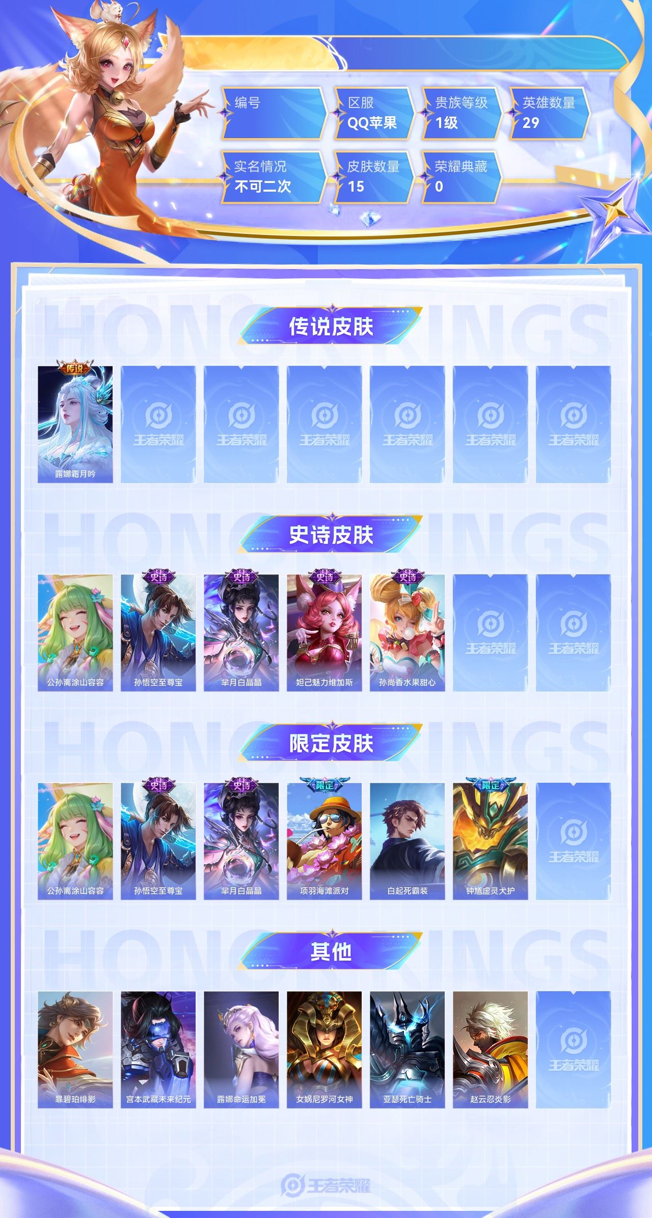 【终身找回包赔】【5级铭文数量0 召唤师等级0 白银Ⅰ 贵族V0】【终身找回包赔】【6ZKKKDGHD】传说1史诗5限定6英雄29皮肤15贵族1级总场次311皮肤价值:10420 【传说皮肤1】露娜霜月吟 【史诗皮肤5】公孙离涂山容容孙悟空至尊宝芈月白晶晶妲己魅力维