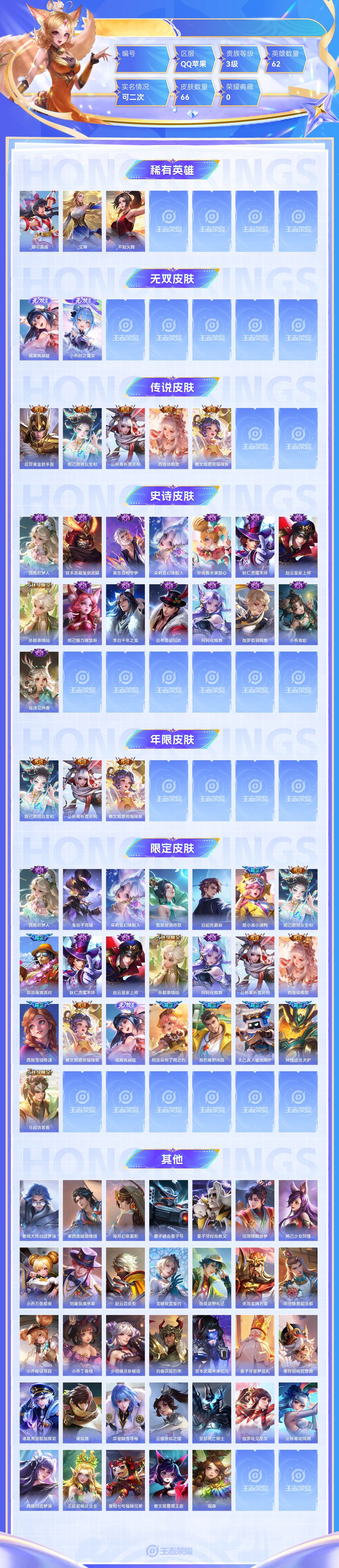 【终身找回包赔】【5级铭文数量0 召唤师等级0 白银Ⅰ 贵族V0】【终身找回包赔】【6ZKKKF2D1】无双2传说5史诗15限定22英雄62皮肤66稀有英雄3贵族3级总场次261皮肤价值:40176 【无双皮肤2】瑶真我赫兹小乔时之魔女 【传说皮肤5】后羿黄金射手座