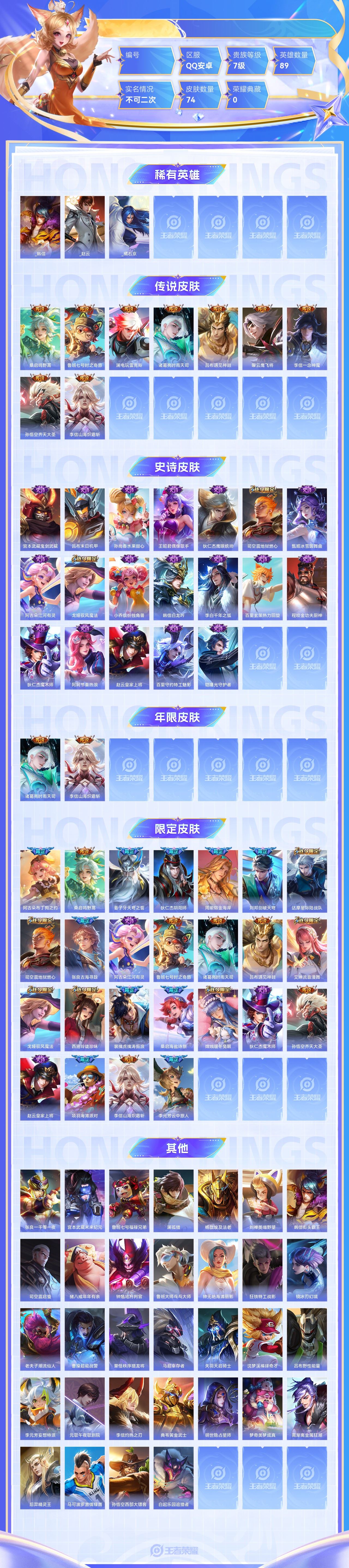 【终身找回包赔】【5级铭文数量0 召唤师等级0 白银Ⅰ 贵族V0】【终身找回包赔】【6ZKKKCFF2】传说9史诗19限定25英雄89皮肤74稀有英雄3贵族7级总场次935皮肤价值:51612 【传说皮肤9】桑启鸣野蒿鲁班七号时之奇旅澜电玩雷克斯诸葛亮时雨天司吕布遇