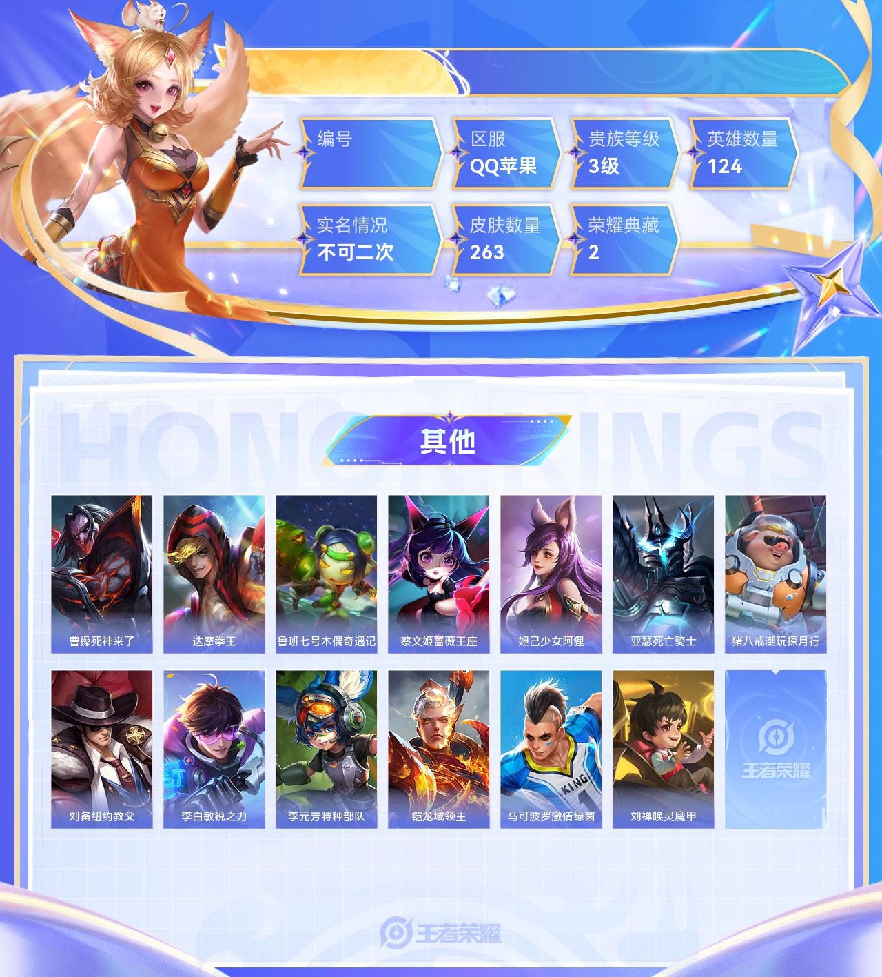 【终身找回包赔】【5级铭文数量0 召唤师等级0 白银Ⅰ 贵族V0】【终身找回包赔】【6ZKKKBCA1】珍品传说3典藏2传说14史诗73限定91英雄124皮肤263稀有英雄8贵族3级总场次12128皮肤价值:203848 【珍品传说3】孙策时之奇旅鲁班七号江户川柯南