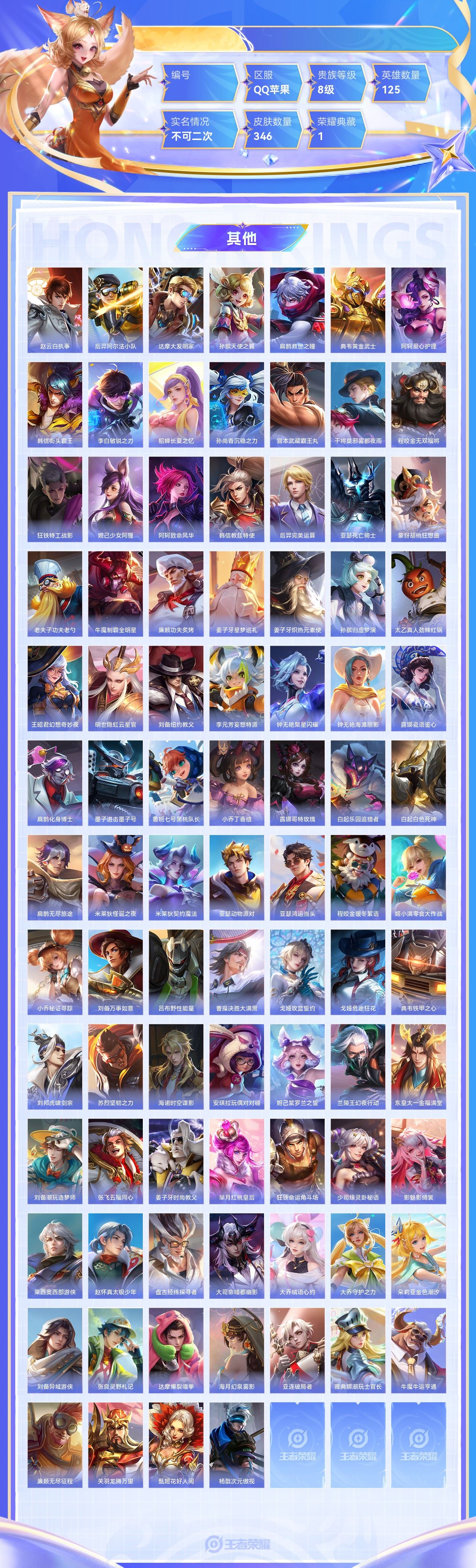 【终身找回包赔】【5级铭文数量0 召唤师等级0 白银Ⅰ 贵族V0】【终身找回包赔】【6ZKKKG2GB】珍品传说2典藏1传说13史诗97限定93英雄125皮肤346稀有英雄9贵族8级总场次7927皮肤价值:240004 【珍品传说2】暃朽木白哉宫本武藏黑崎一护 【荣