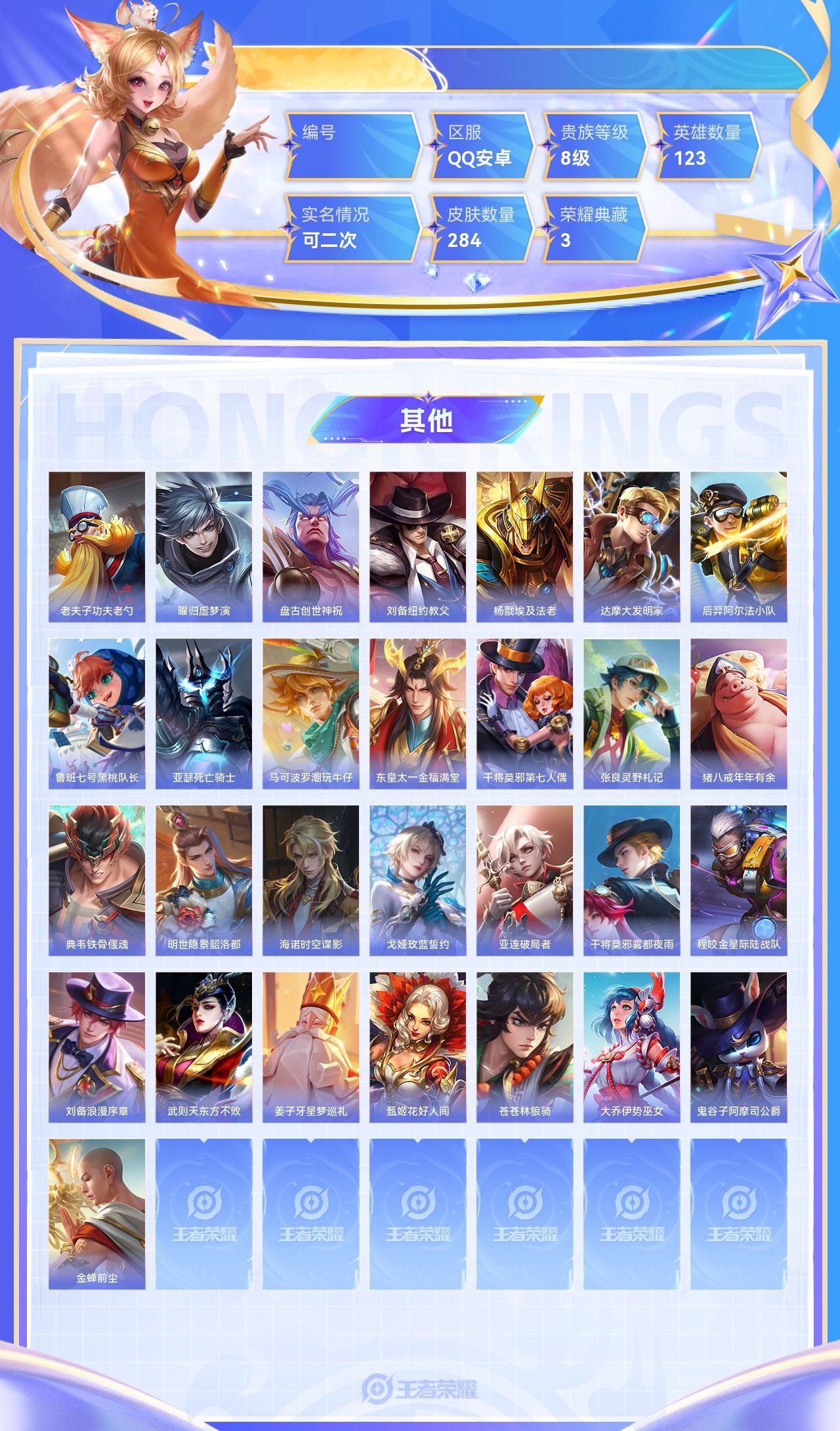 【终身找回包赔】【5级铭文数量0 召唤师等级0 白银Ⅰ 贵族V0】【终身找回包赔】【6ZKKKEGD1】无双1典藏3传说15史诗82限定85英雄123皮肤284稀有英雄8贵族8级总场次8866皮肤价值:243448 【无双皮肤1】诸葛亮天机白泽 【荣耀典藏3】李白鸣