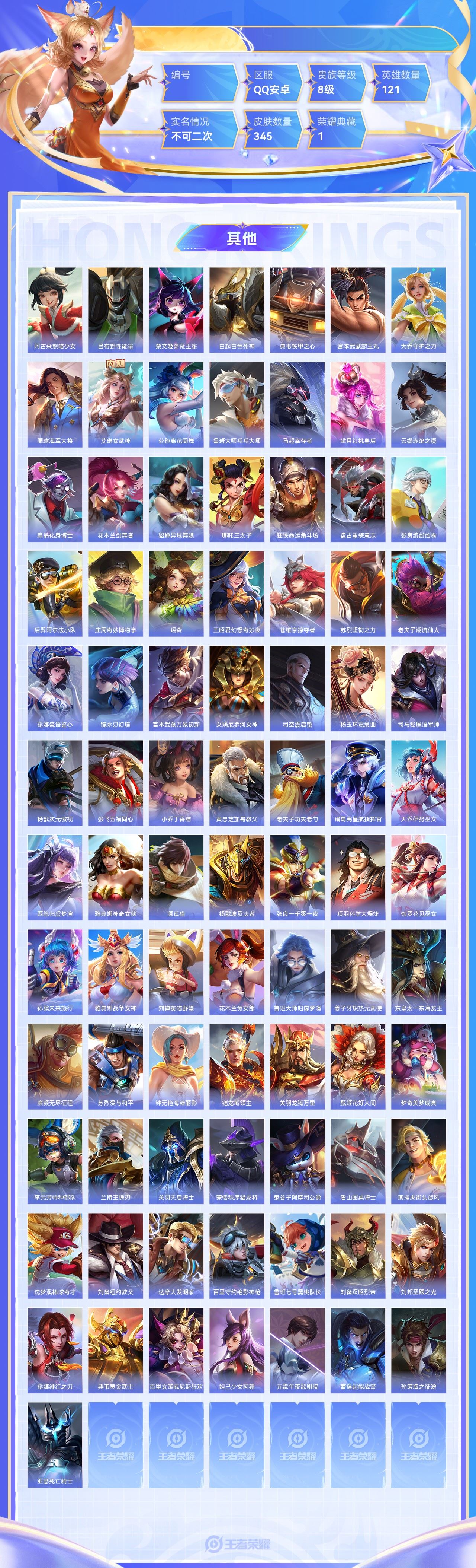 【终身找回包赔】【5级铭文数量0 召唤师等级0 白银Ⅰ 贵族V0】【终身找回包赔】【6ZKKKHAFG】典藏1传说20史诗93限定112英雄121皮肤345稀有英雄8贵族8级总场次12915皮肤价值:238524 【荣耀典藏1】孙悟空全息碎影 【传说皮肤20】梦奇胖