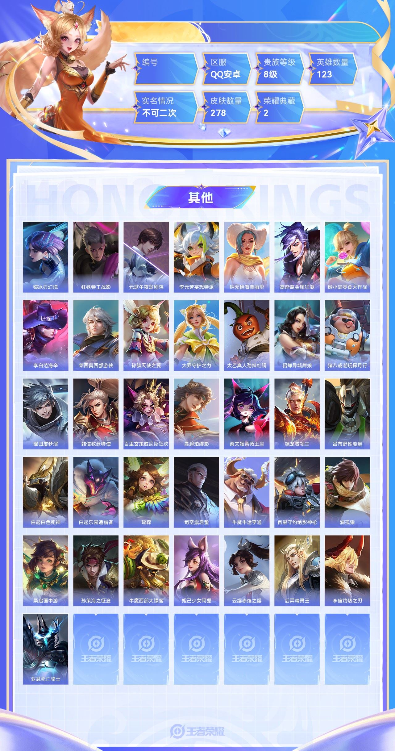 【终身找回包赔】【5级铭文数量0 召唤师等级0 白银Ⅰ 贵族V0】【终身找回包赔】【6ZKKKC1HF】珍品传说3无双2典藏2传说23史诗67限定89英雄123皮肤278稀有英雄8贵族8级总场次4978皮肤价值:230304 【珍品传说3】瑶大耳狗之梦安琪拉酷洛米之