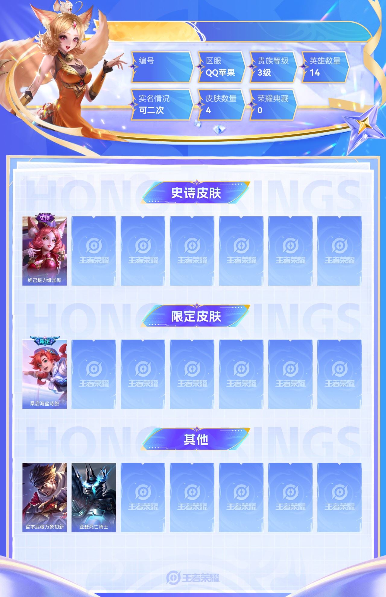 【终身找回包赔】【5级铭文数量0 召唤师等级0 白银Ⅰ 贵族V0】【终身找回包赔】【6ZJN0E2HC】史诗1限定1英雄14皮肤4贵族3级总场次78皮肤价值:2352 【史诗皮肤1】妲己魅力维加斯 【限定皮肤1】桑启海盐诗旅 【其他2】宫本武藏万象初新亚瑟死亡骑士【