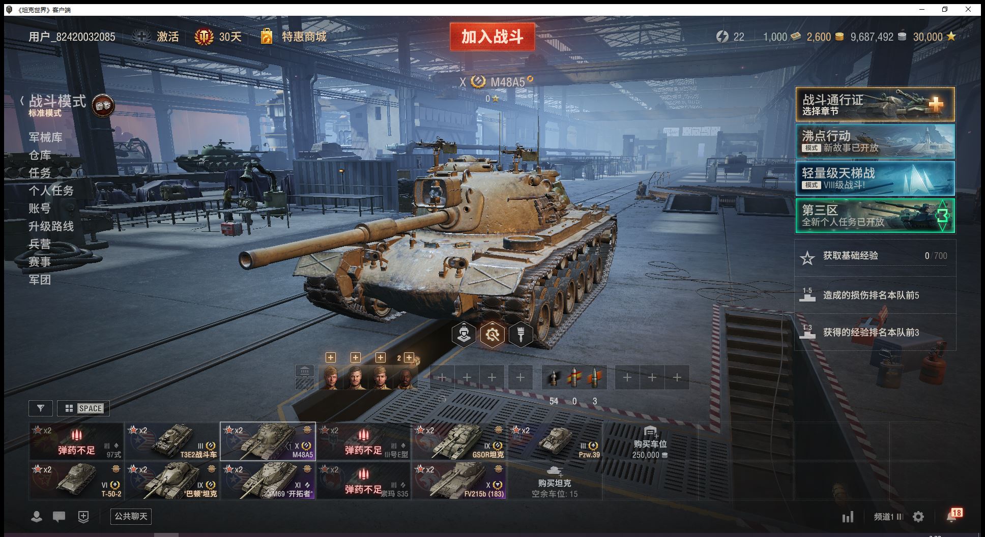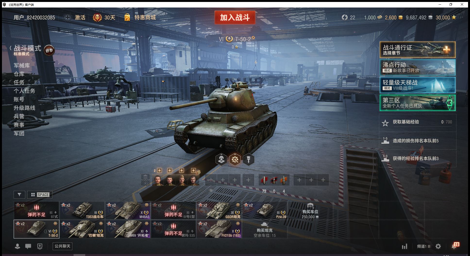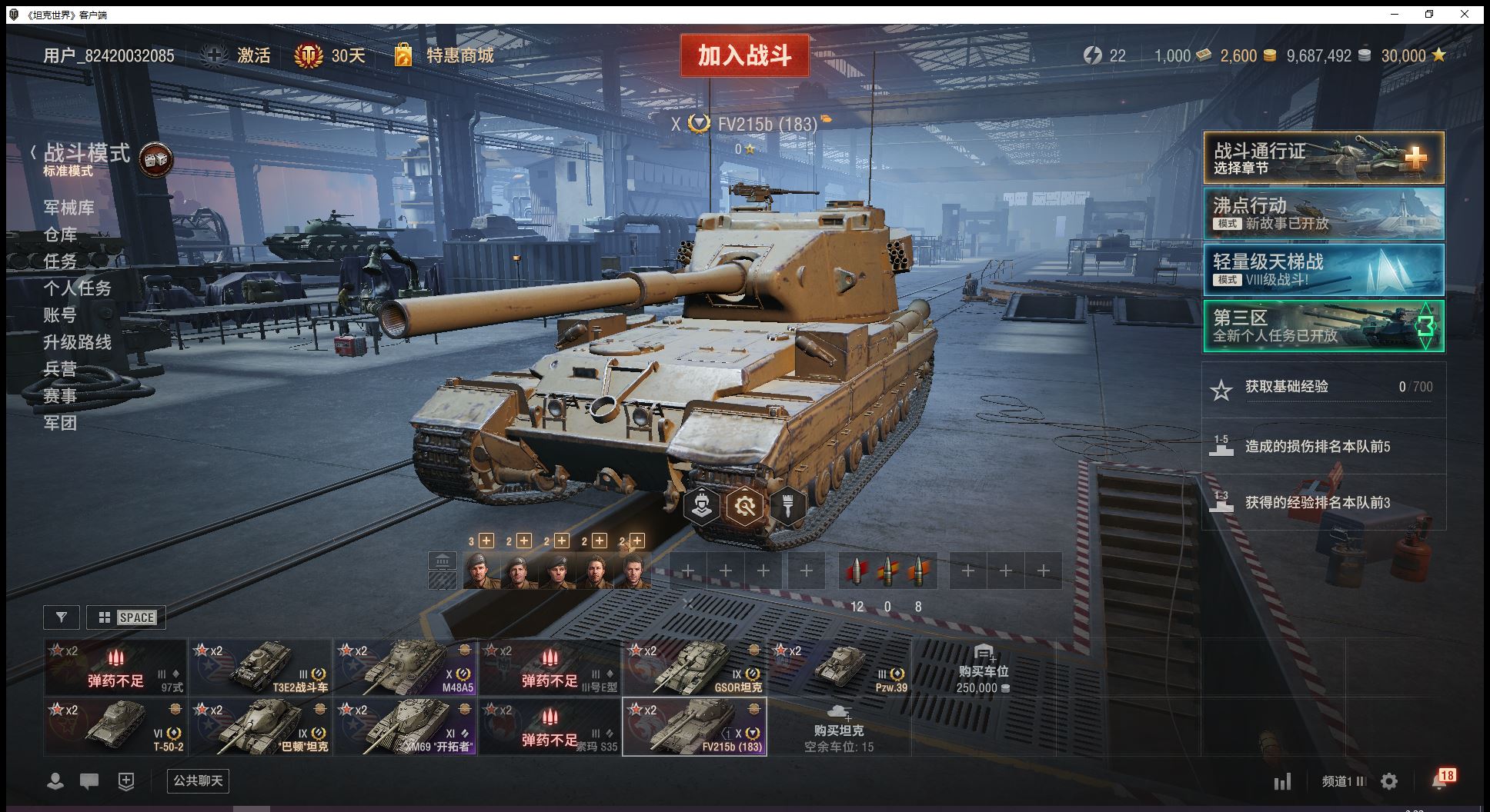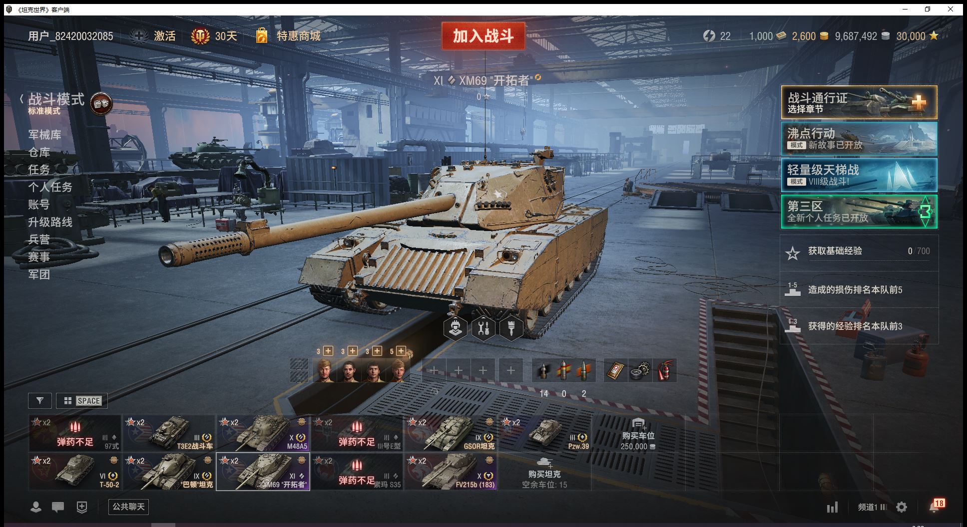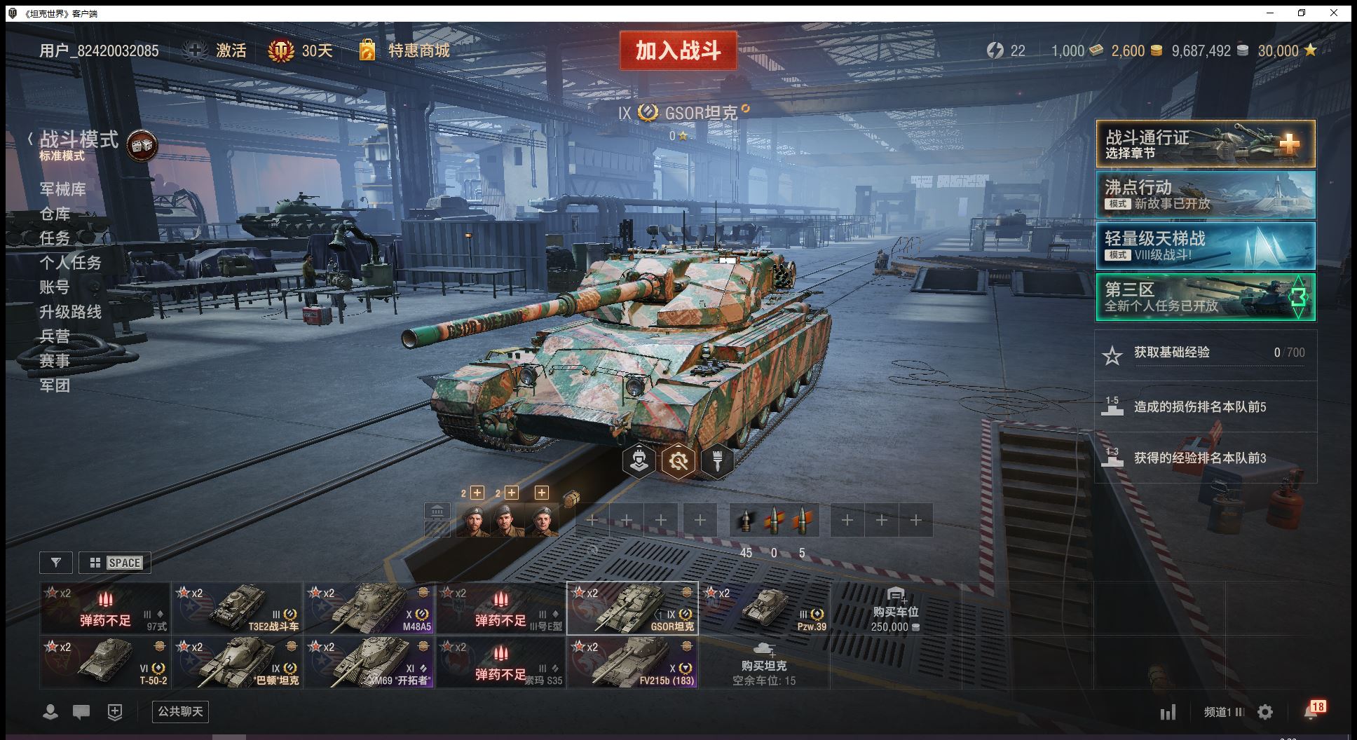 11级开拓者10级183大巴顿2辆9级金币车巴顿坦克GSOR坦克6金T502金币2600全局3万(J30)