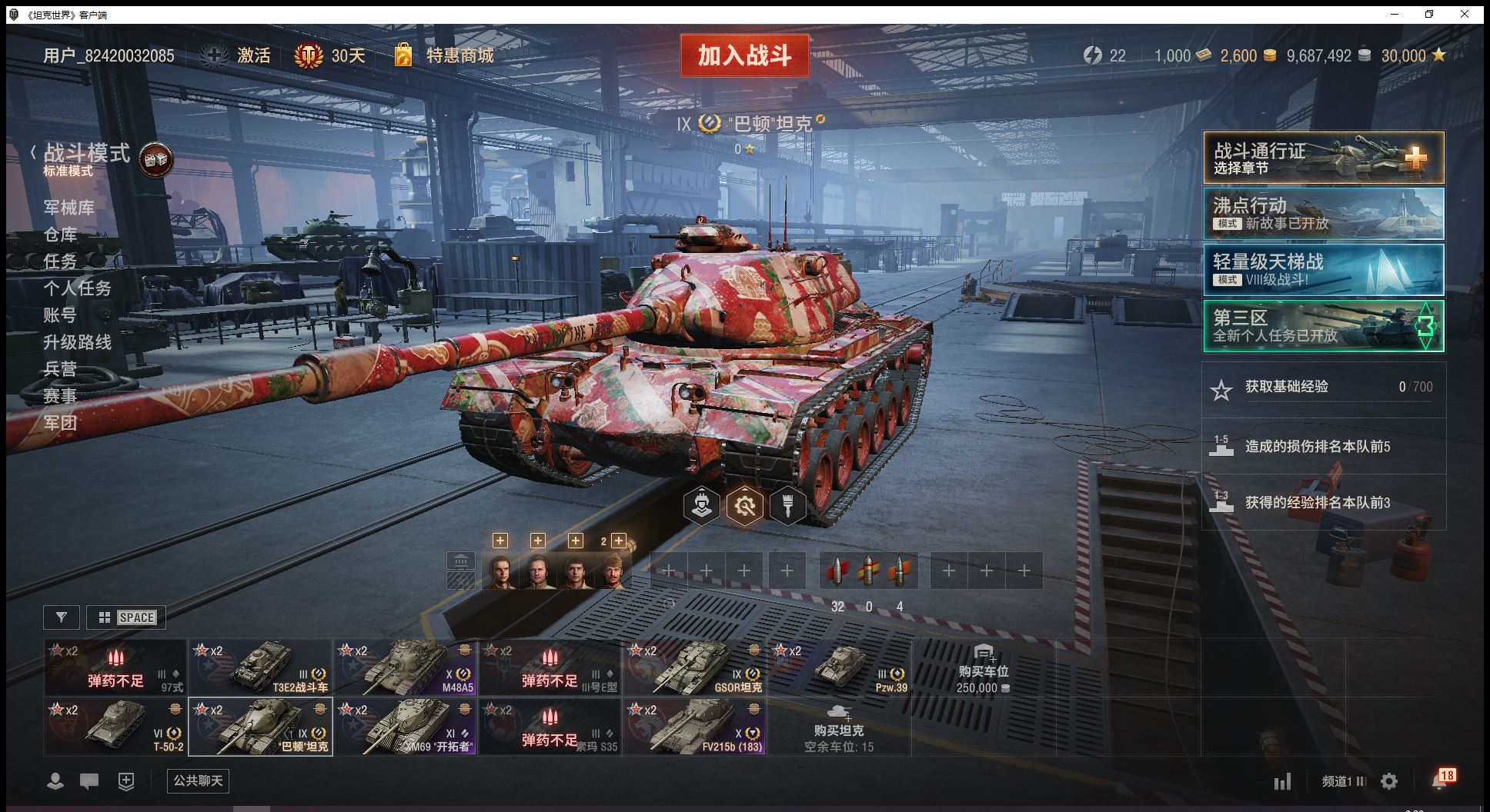 11级开拓者10级183大巴顿2辆9级金币车巴顿坦克GSOR坦克6金T502金币2600全局3万(J30