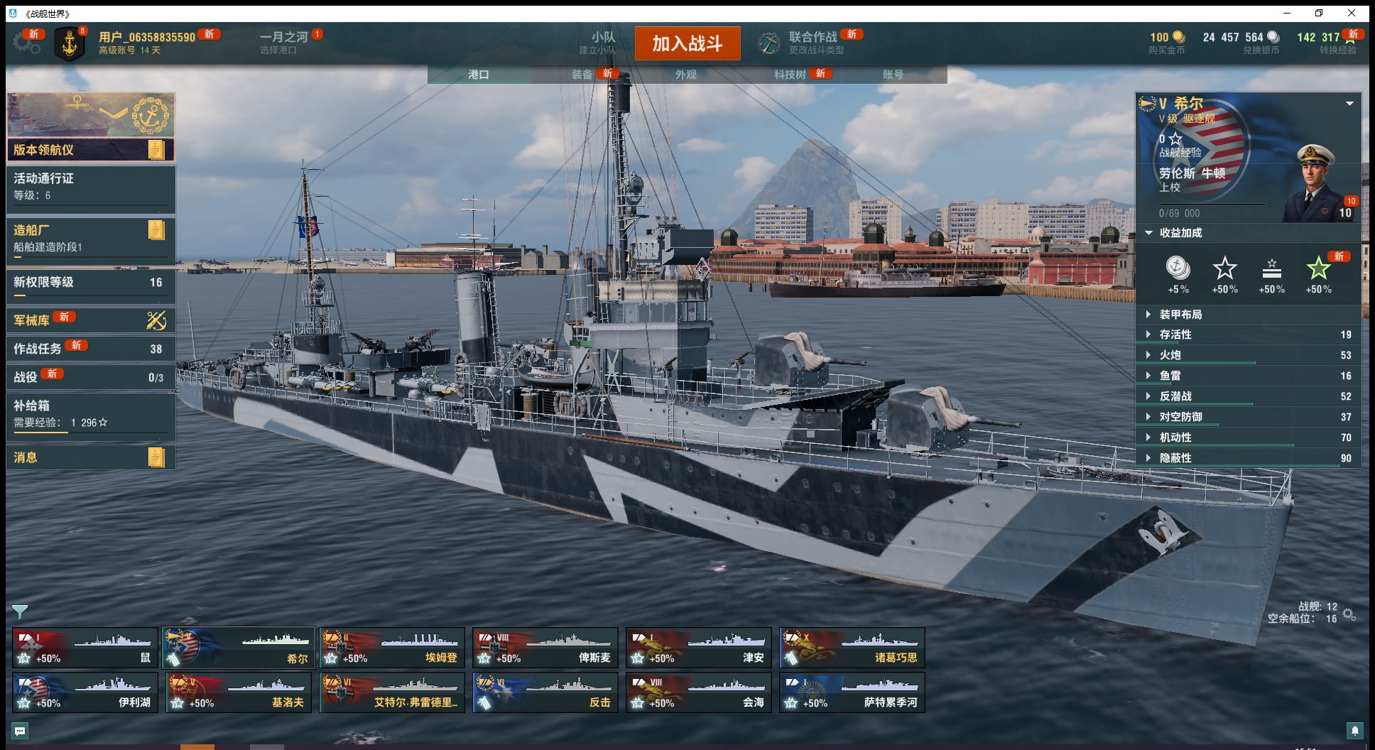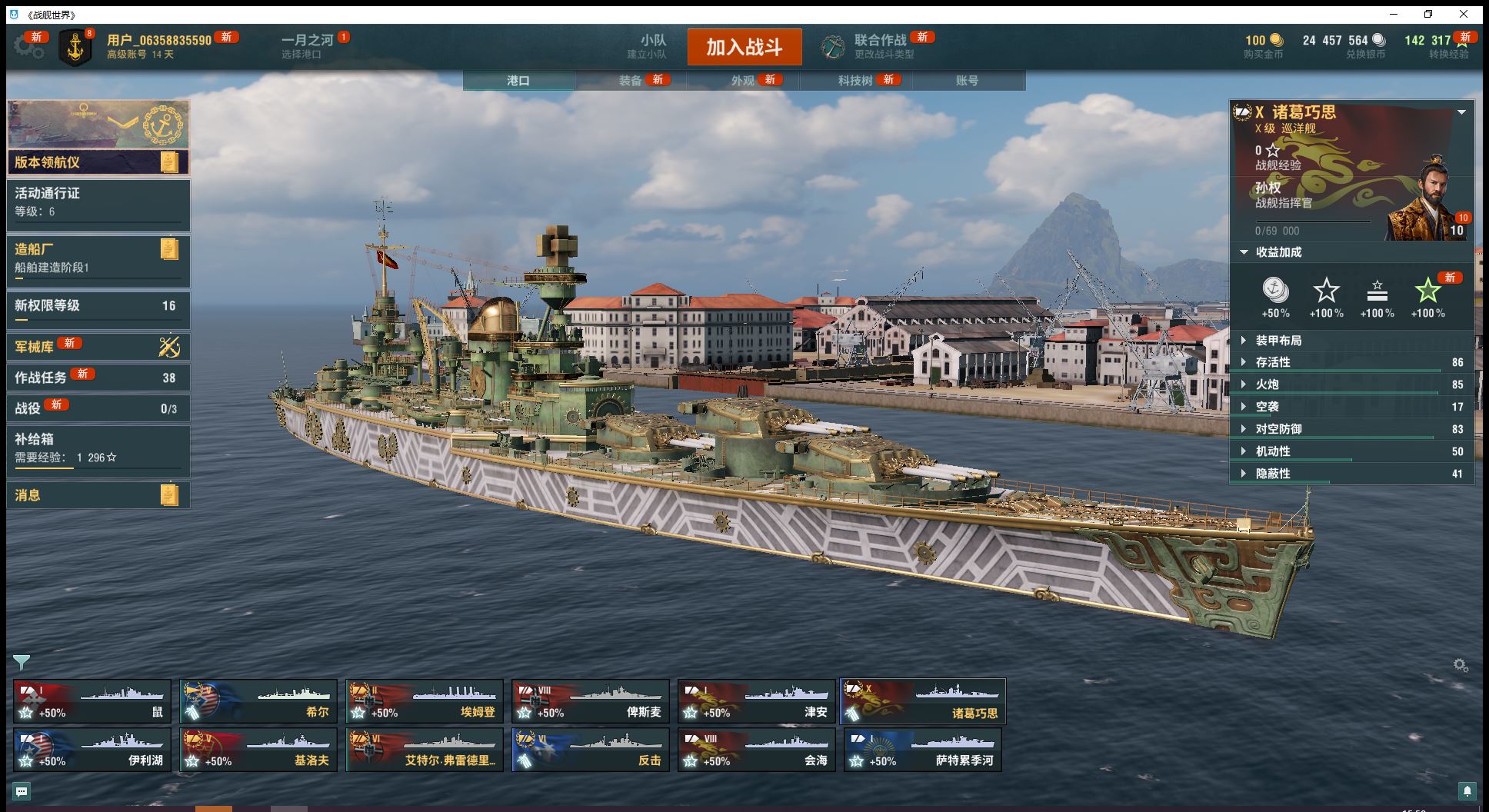 10级金币船诸葛巧思(带皮肤)2艘8级俾斯麦会海2艘6金反击艾特尔2艘5金希尔基洛夫煤炭6.4万、全局14万(J39)
