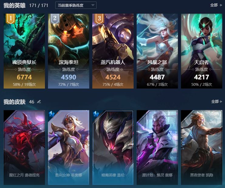 【英雄数量171 皮肤数量46 璀璨钻石IV 魔法引擎数量0 10万以上 召唤师等级313 】只打过单双排和灵活排