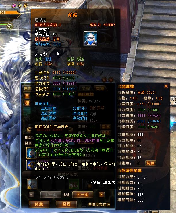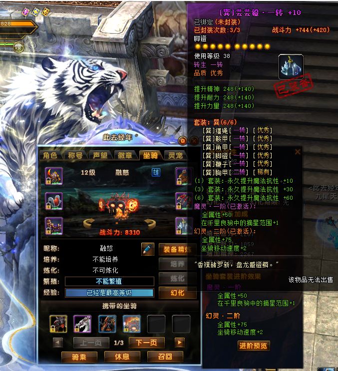 装备登封套,坐骑一转优秀套,有酷酷宝宝。详细的可以让平台截图查看。