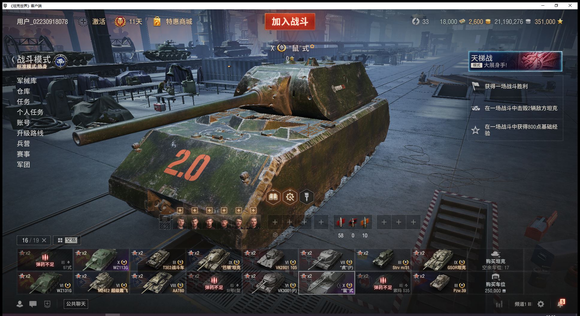 可研发11级10级鼠式WZ113G8级金币车AAT609级特种巴顿坦克GSOR坦克6级特种超级霞飞VK2801银币2100万债券1.8万金币2600全局35万(J61)