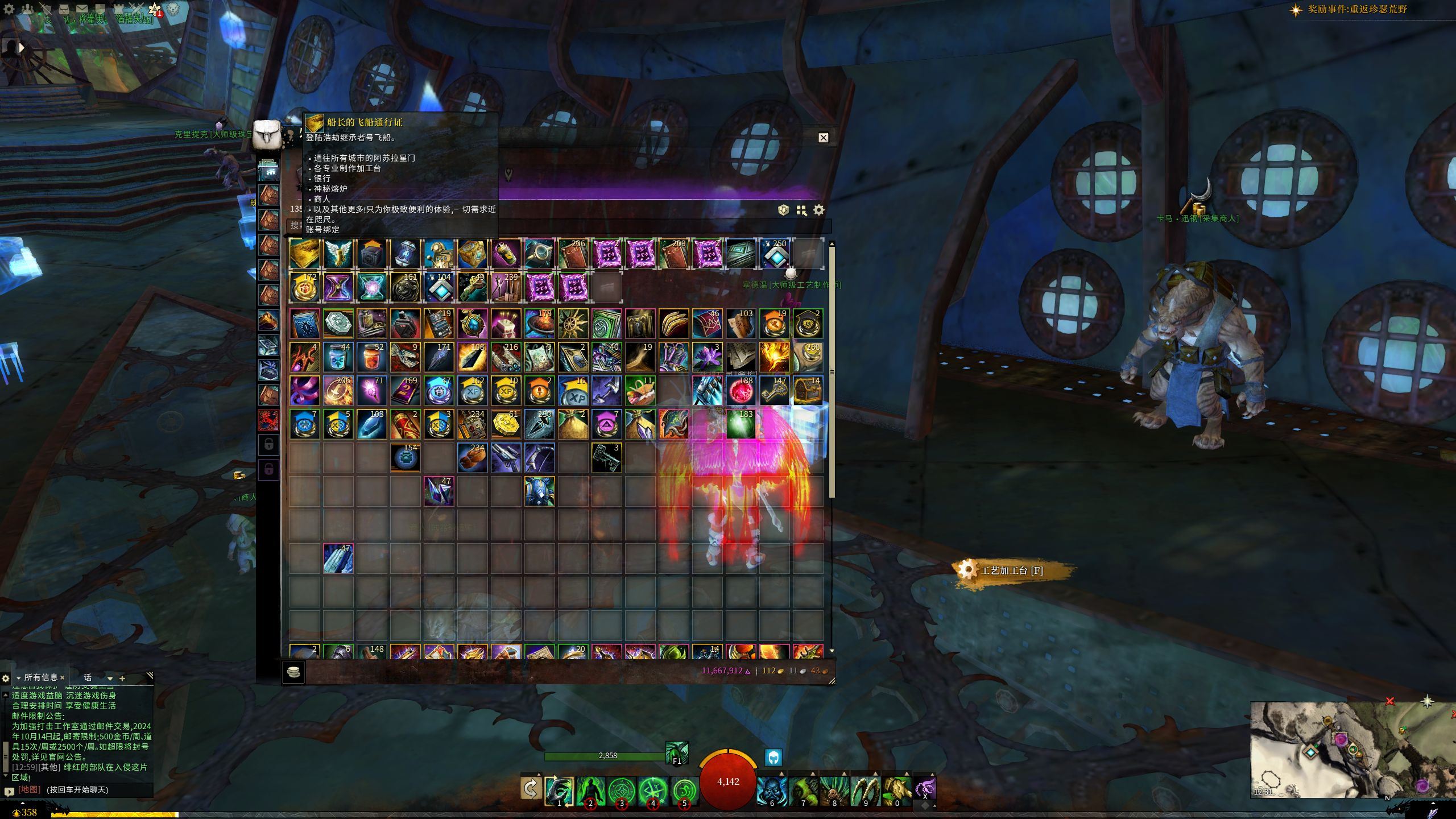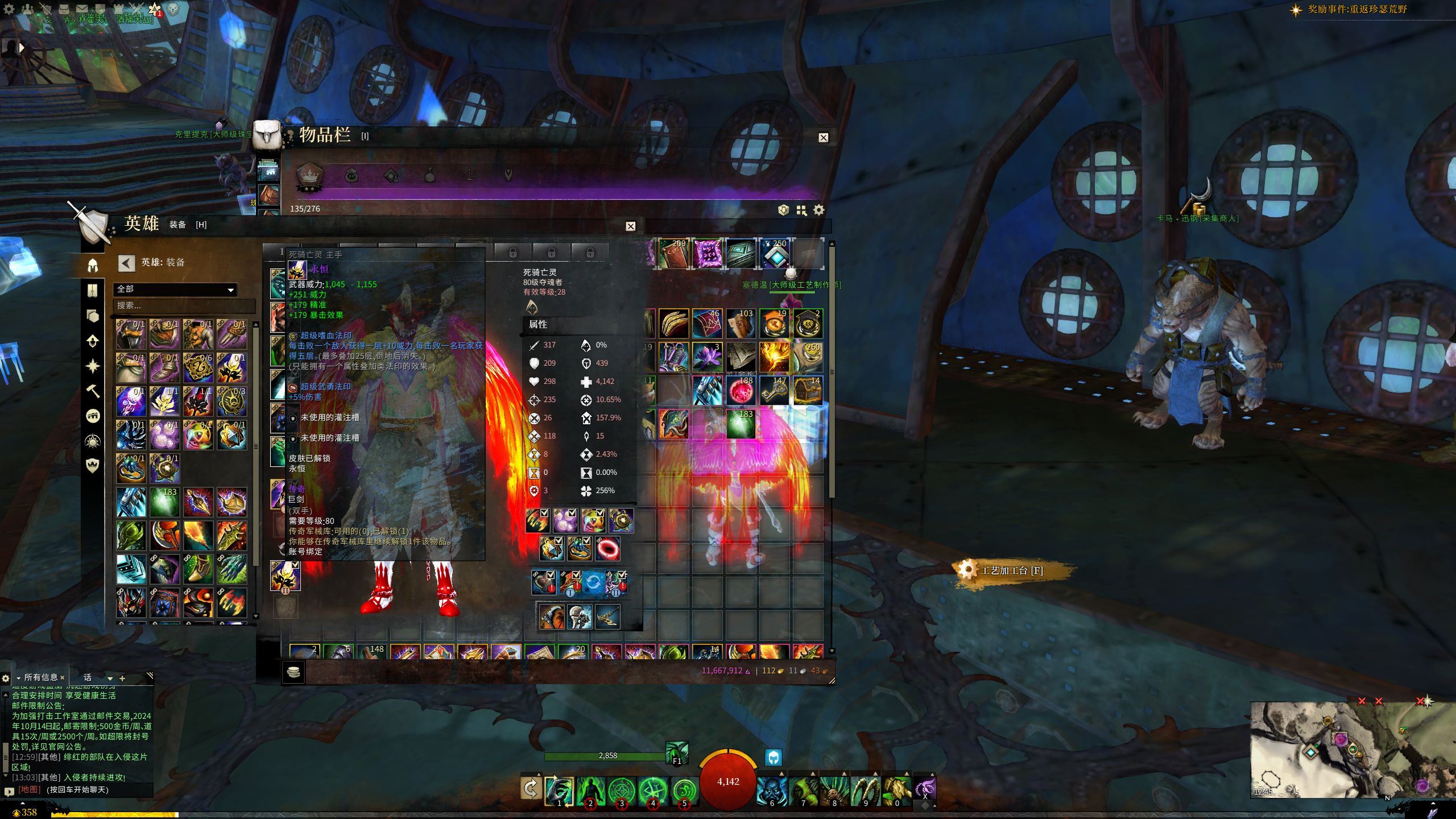 全身除了水下的武器是粉装,然后戒指有一个10人本才出的不是传奇,其余全部是传奇,轻甲的,符文法印也全是传奇,传奇就说明自己想哪个属性玩直接切换就可以。大剑是传奇永恒。 激活码只买到决战迈古玛。 制作除后面出的抄写员,其余全部满级。 人物也是各职业80级满级共有八九个。 仓库材料卖卖也有好多,做传奇的礼赠有3套整的放在仓库,在做传奇很方便。 爵位还有没用的259天左右放在背包169单天+3个30天的。