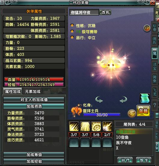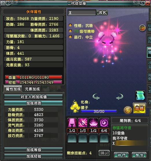 女猛将,满天赋,28攻,40万防,57万血,带1套宝宝,4条不错尾巴,36万珠宝,金币4.7万,仓库好东西多多,物超所值
