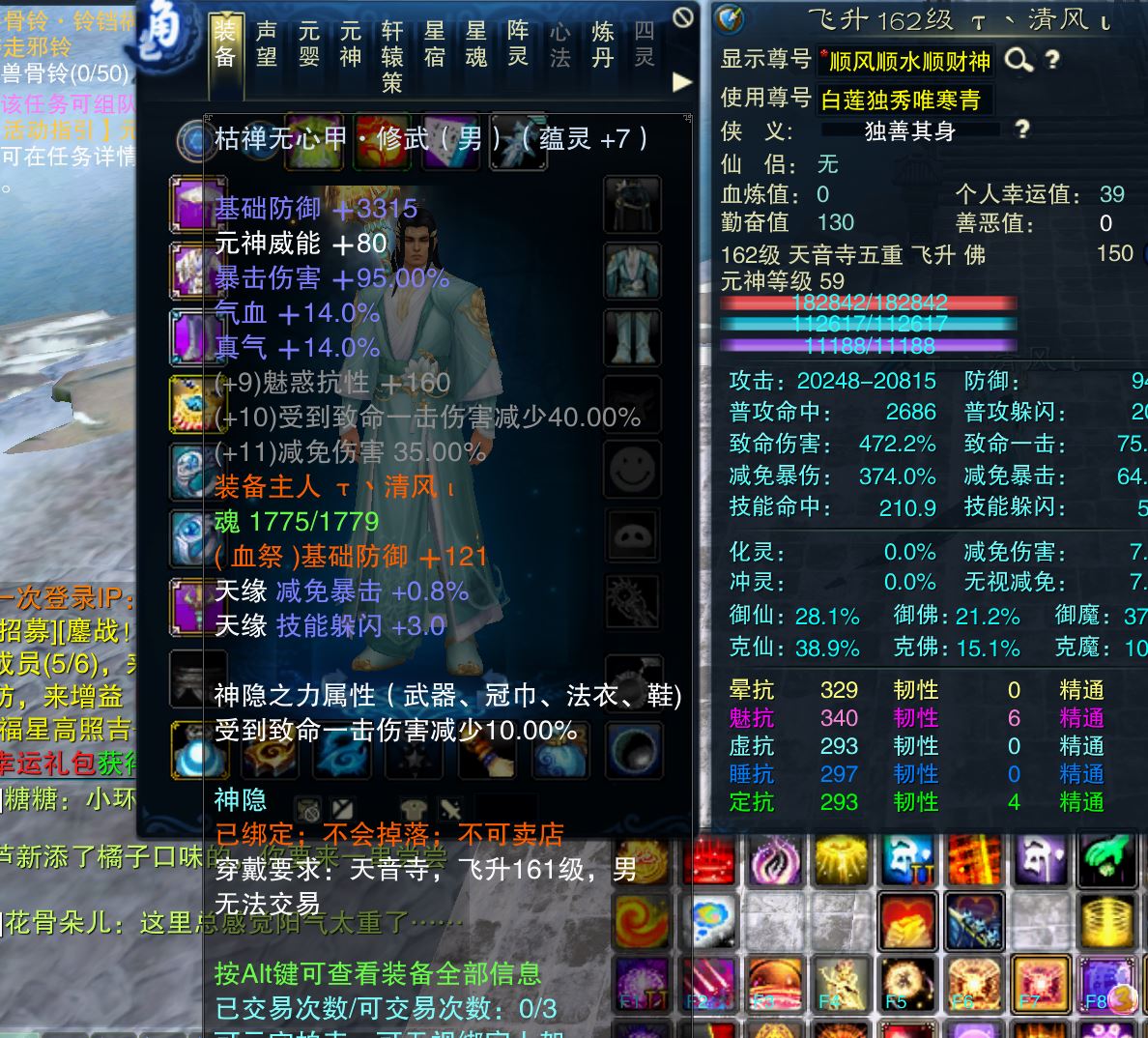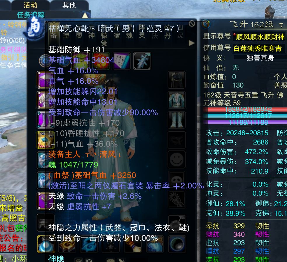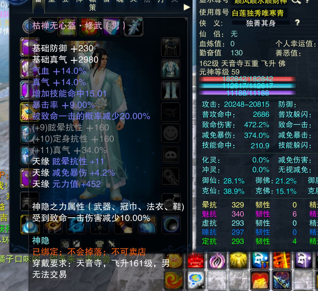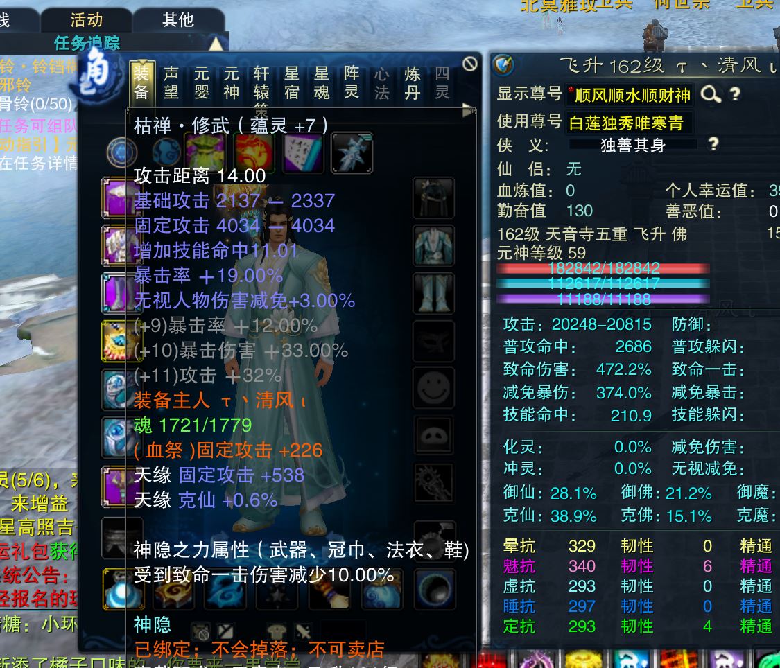 【天音 五重修真 男 角色等级162 佛 人族 】昭武鞋子其他修武副本随便混,号上还有28元宝,装备自己看图