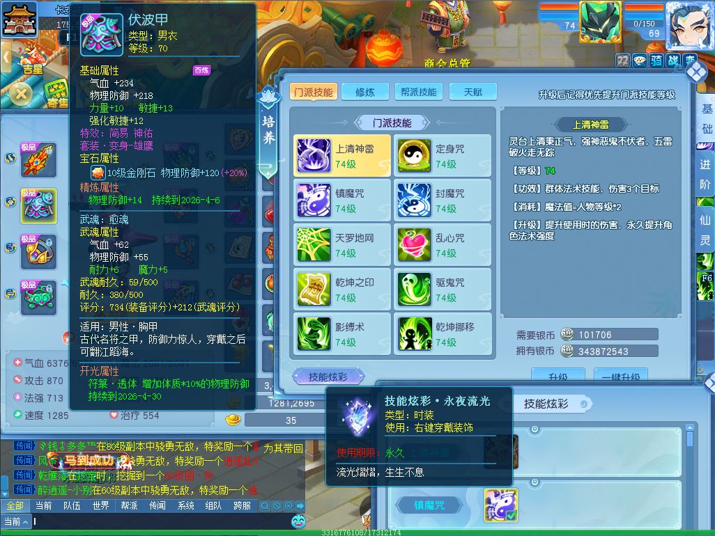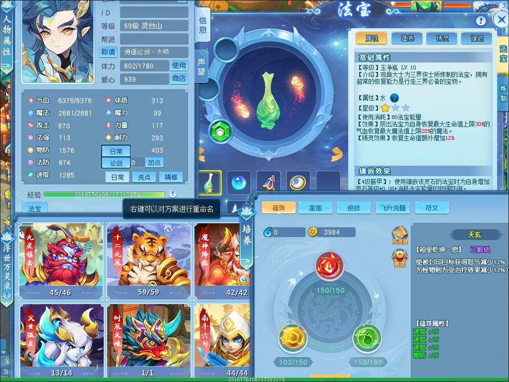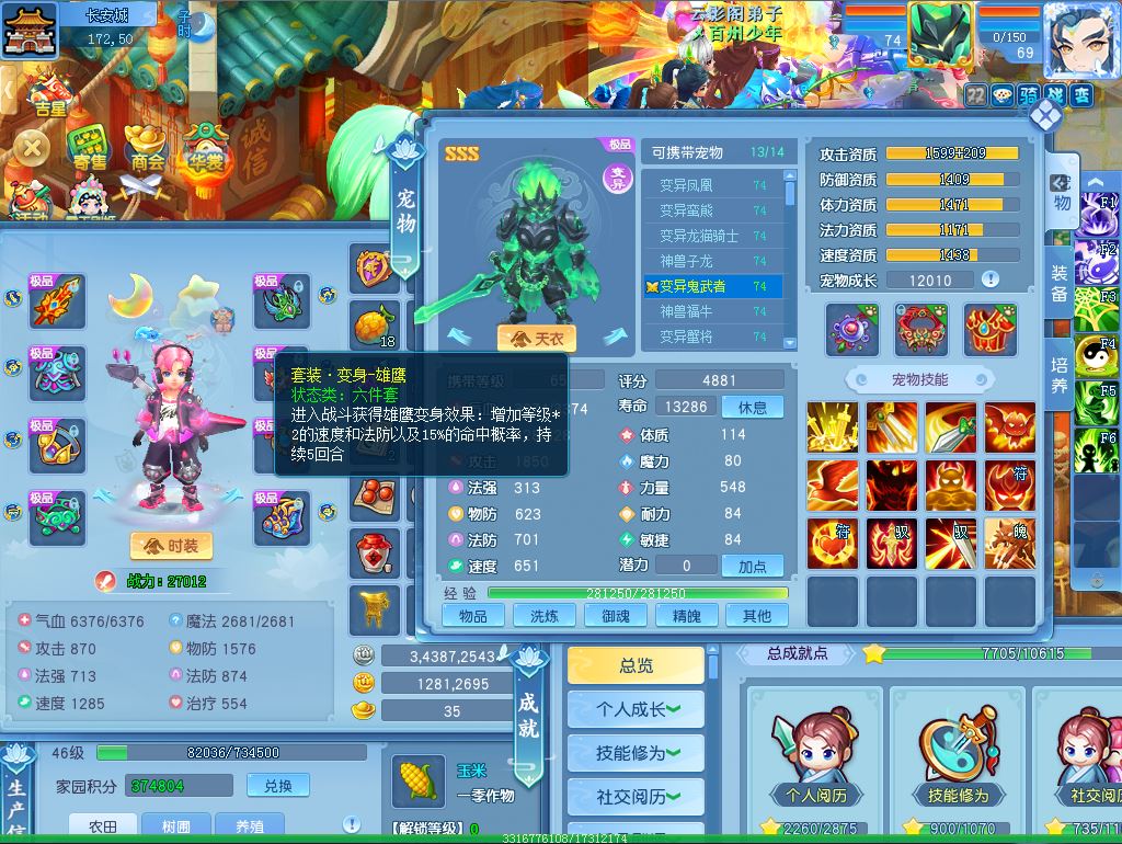 逍遥情缘PC电脑端春满山河区,69灵台2W7战简易雄鹰6套特技全愤怒腰。瑞凤祥龙骓风马麒麟10坐骑三血统坐骑,音浪玩趣星海时装萌新青丘晨曦三光环永夜技能炫彩。9J龙猫8红天衣凤凰剑阵天衣鬼武,双128大神兽一内丹带双孩。两套点天赋满星图已开四法宝,有豪宅倒金装备带千万金总充10万。