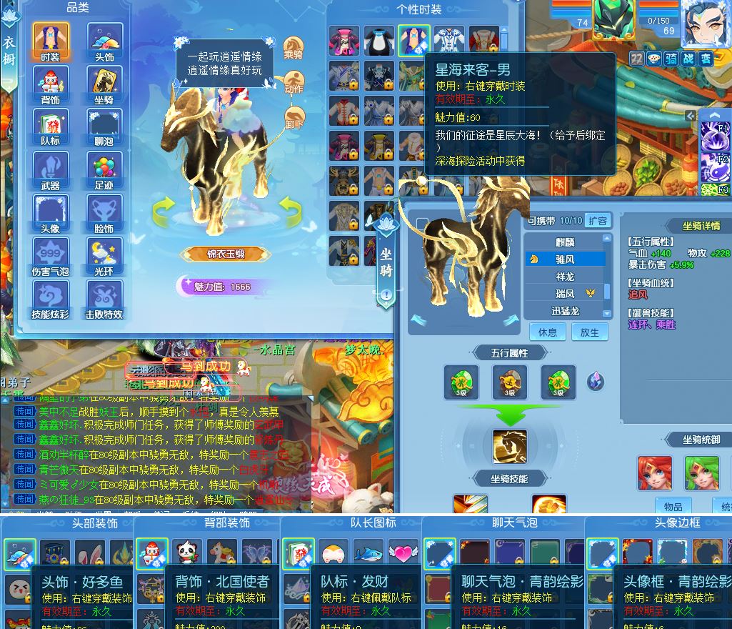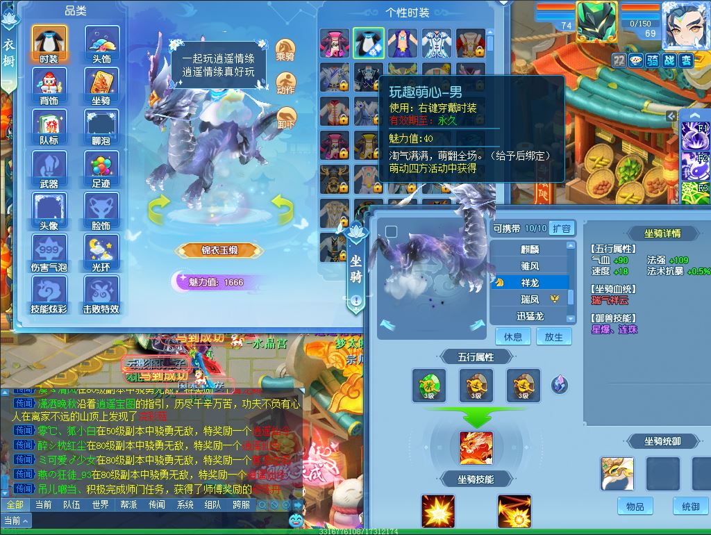逍遥情缘PC电脑端春满山河区,69灵台2W7战简易雄鹰6套特技全愤怒腰。瑞凤祥龙骓风马麒麟10坐骑三血统坐骑,音浪玩趣星海时装萌新青丘晨曦三光环永夜技能炫彩。9