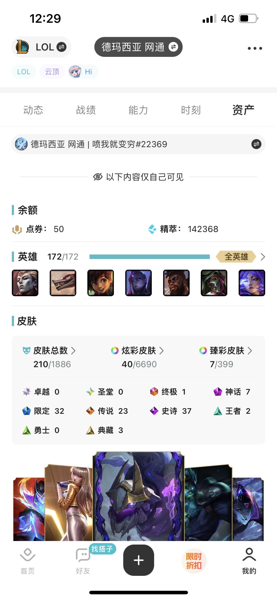 【终身找回包赔】【英雄数量172 皮肤数量211 无段位 10万以上 召唤师等级319 】可小刀