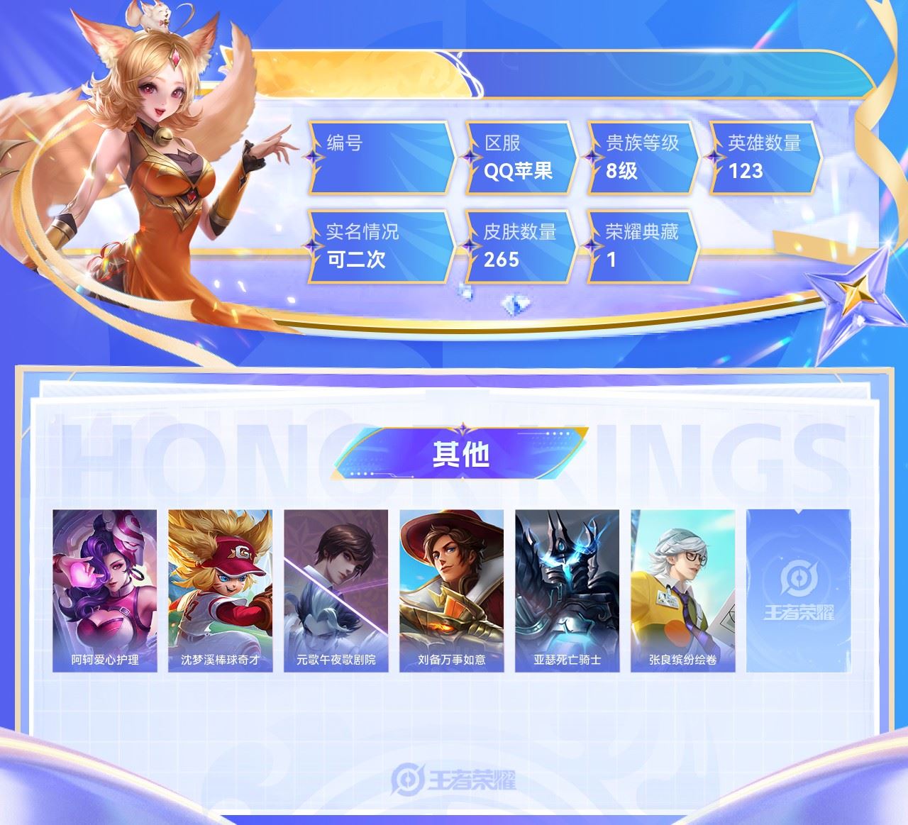 【终身找回包赔】【5级铭文数量0 召唤师等级0 白银Ⅰ 贵族V0】【终身找回包赔】【6Q87MHFEF】珍品传说1典藏1传说17史诗82限定87英雄123皮肤265稀有英雄8贵族8级皮肤价值:200130 【珍品传说1】孙策时之奇旅 【荣耀典藏1】李白鸣剑曳影 【传