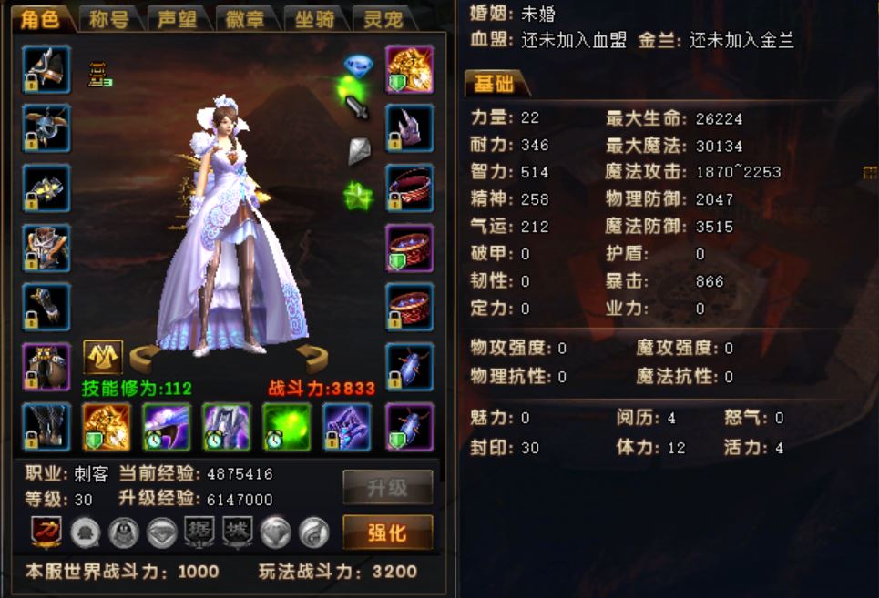 【刺客 女 角色等级30 可以二次实名 】3800战力