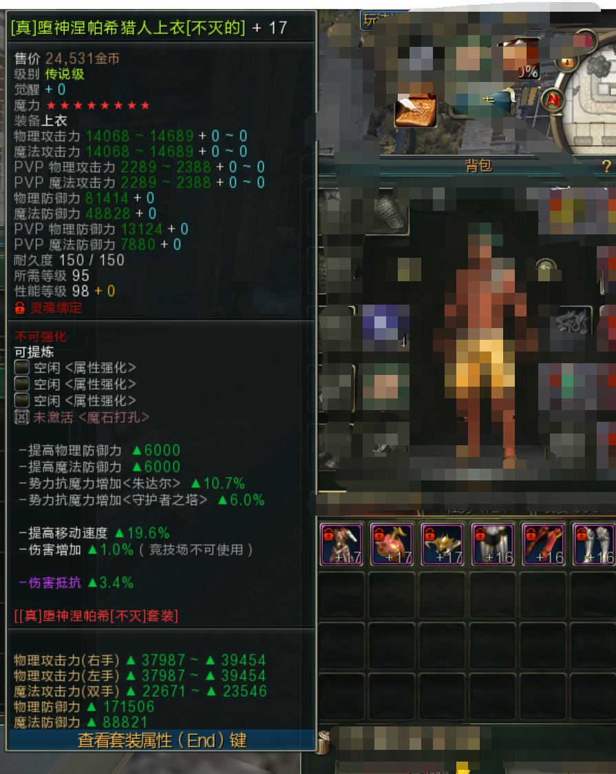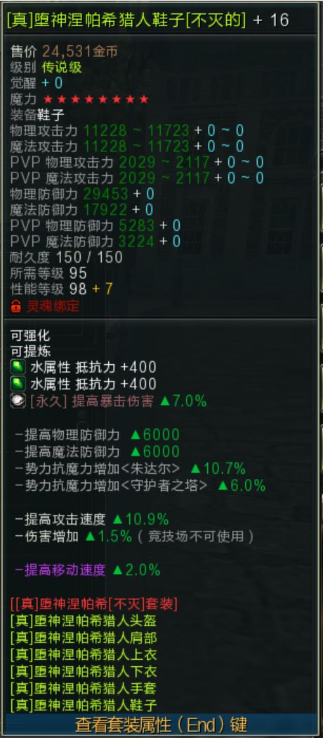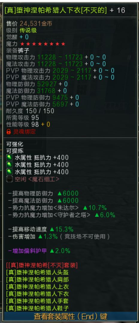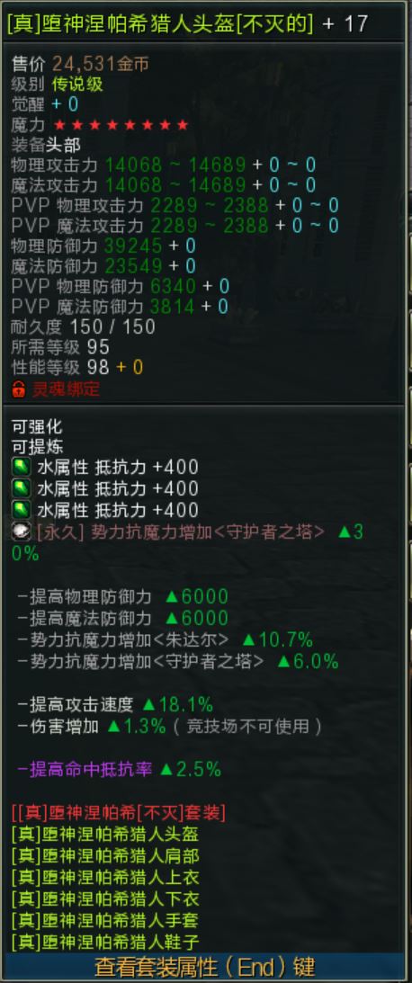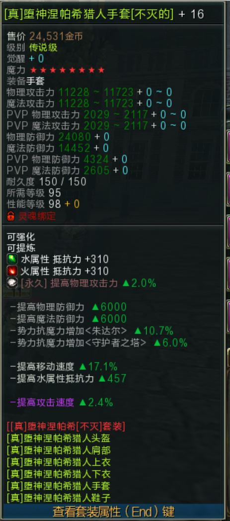〖真〗堕神涅帕希猎人不灭防具,一套6件,3件+17,3件+16,魔力八星【买家自带解绑】