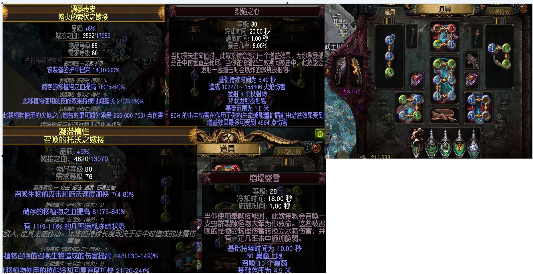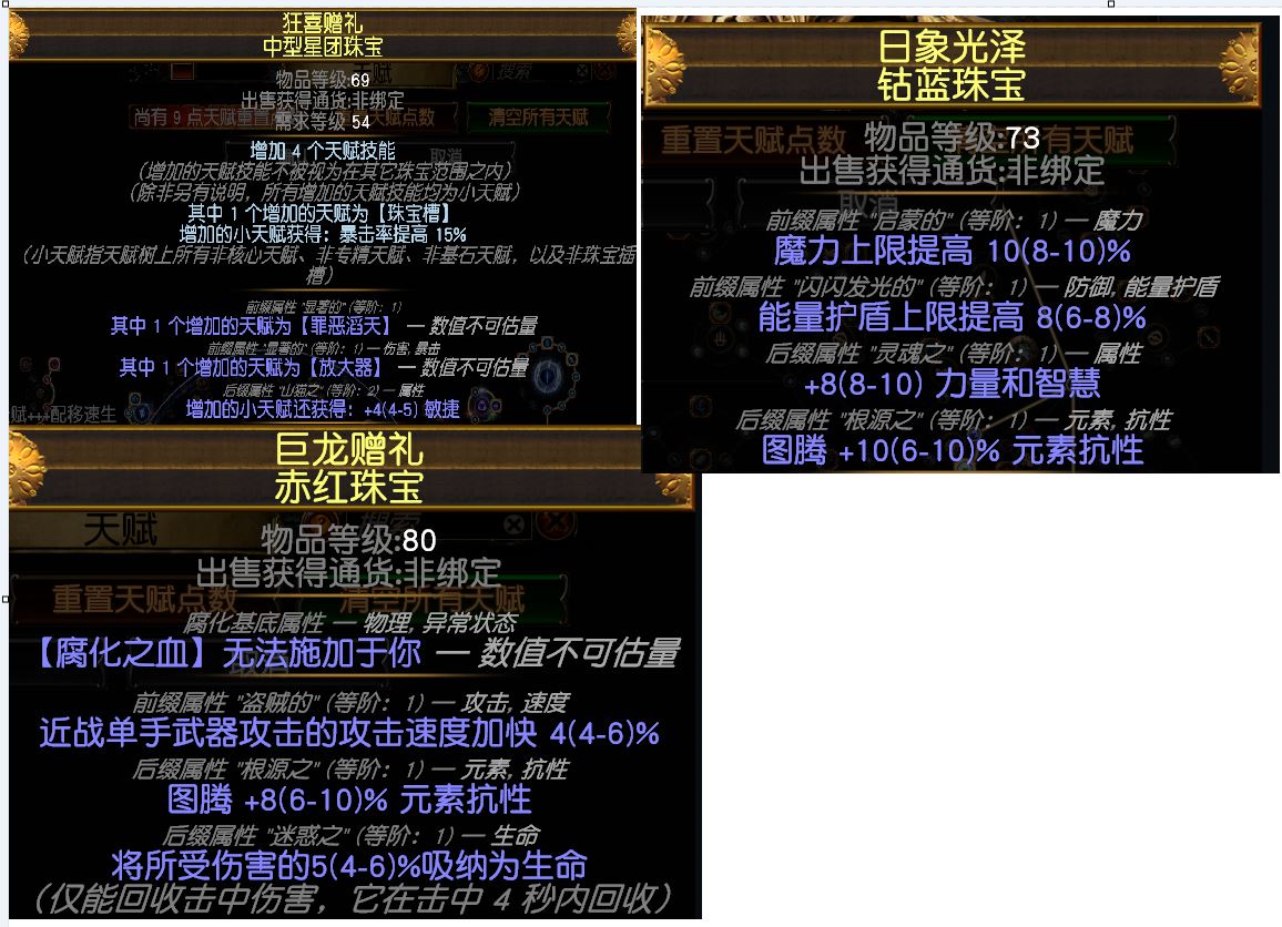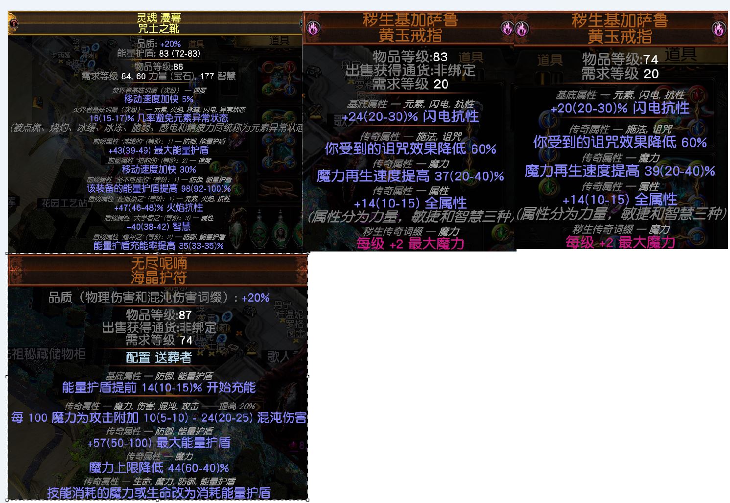 28赛季毕业女巫赛季内容一路秒。而且不用动。范围巨大!操作起来也非常轻松就只需要按位移和攻击。玩起来非常安逸。接近8千护盾!抗性全满。无视混沌伤害。双格挡65.免疫诅咒。生存拉满!全身都是T1级别毕业装备。完美的星团和珠宝。所有装备细节图里都有!全部的装备,包括药水。珠宝,星团。嫁接物。技能石都是配好的。一次性全部带走。根本不用为了想着怎么配装而烦恼。穿上直接开爽!84级就可以穿