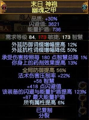 S28唯一真镜子衣服全局法术压制智慧闪避值闪避与能量护盾 最大能量护盾所有属性