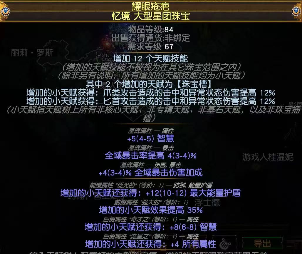 S28镜子珠宝复制件命中人忆境大型珠宝爪类攻击击中异常状态增加小天赋匕首攻击击中异常状态全域暴击率全域加成护盾最大护盾所有属性