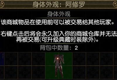 单独一件身体外观:阿修罗,可以另外购买身体外观因陀罗合成为超级帅,能发光且流放1和2通用的梵天时装