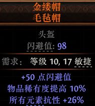 【金缕帽毛毡帽 稀有度提高,全元】金缕帽毛毡帽 稀有度提高,全元素抗性,闪避高,10级可带开荒极品啊
