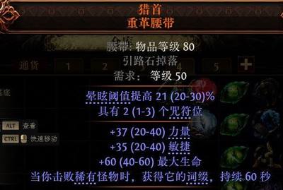 【猎首重革腰带,当你击杀敌人时,】猎首重革腰带,当你击杀敌人时,获得吸收它的词缀属性60秒,毕业腰带