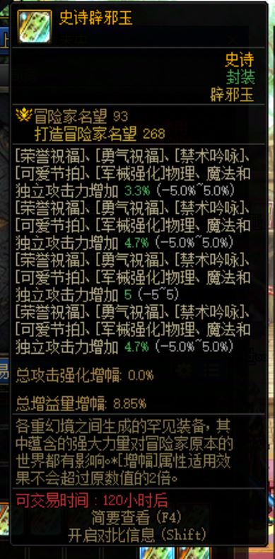 史诗辟邪玉 奶玉荣誉三攻固定5+百分比12.7共17.7,8.85buf量,乱世