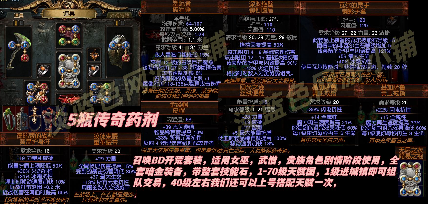 【套装】s29赛季,女巫赦罪召唤新手套装。女巫,贵族,武僧都能用。传奇全套装备。传奇药水,技能石,全都有。
