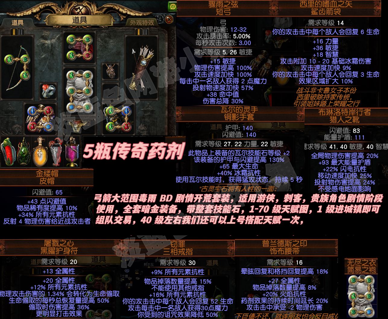 s29赛季,毒雨新手套装。游侠,刺客,贵族都可以使用。传奇全套装备。技能石,天赋。玩法。全都有。需要的拍下联系我,我发给你。
