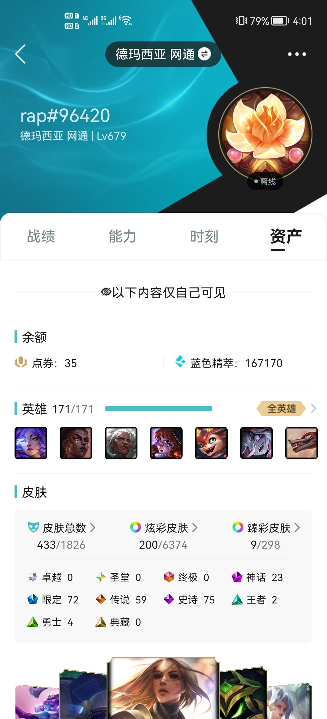 【终身找回包赔】【英雄数量171 皮肤数量433 荣耀黄金IV 魔法引擎数量0 10万以上 召唤师等级679 】急出价格可议