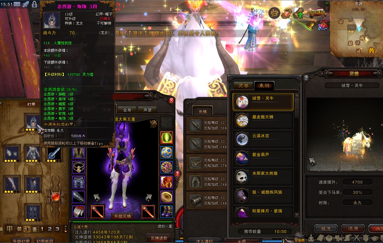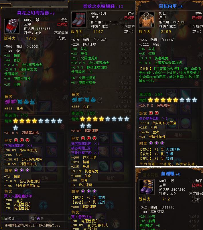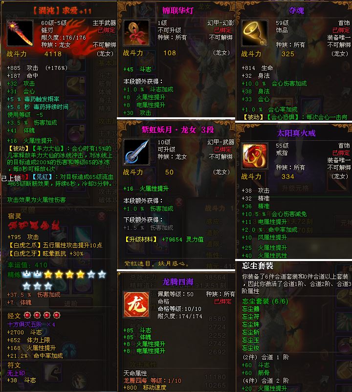 双线四区枯松涧13合1,59龙女万1攻67%伤害1200火提移速鞋,高五+11混沌武器高四三真龙套冥印,有百花血遁夺魂真火戒龙腾命格。3段紫虹妖月念西游幻甲华灯