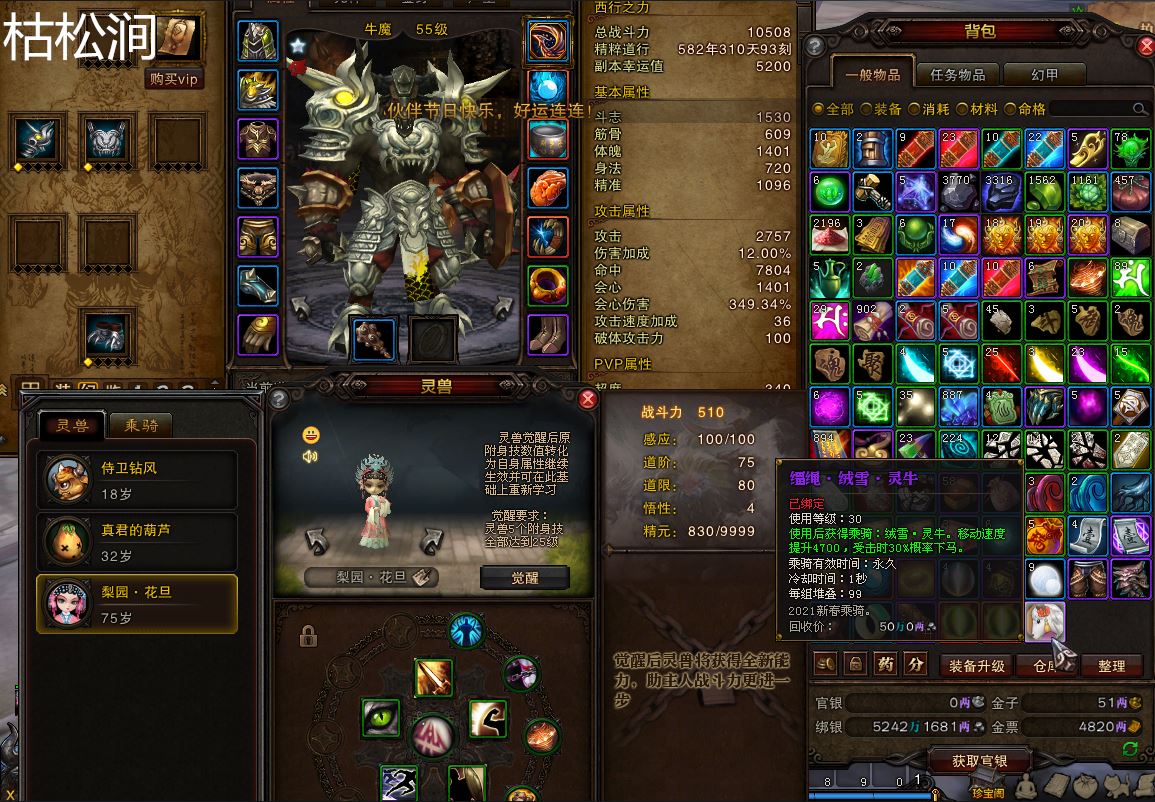 双线四区枯松涧13合1,V8小背景65神将万6攻60%伤害,千6火提千抗2W移速未开光,高三四幻虚套武器降龙血遁百花印,有白骨左耳夺魂真火戒虎啸命格。8D魔化仙姬忘尘套两5孔15兽三,5段晴雪画冰异域梵歌幻甲雪季紫虹,九瑞白灵牛灵角鹿冰宫黎侯虎坐骑,5组卡牌2改名1E绑银W8金票。带枯松涧55牛魔花旦灵兽白灵牛坐骑。