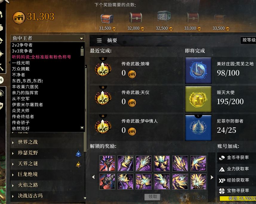 氪金3W多 高成就31000、满专精633、战场2200级 很多32格包包、经验书几千本,可以大量建小号秒满级 传奇骄子和鱼中王者顶级称号、存储2750、