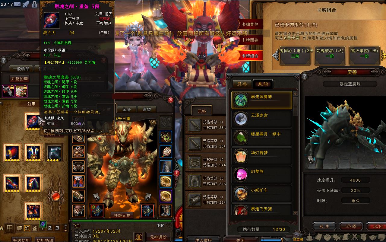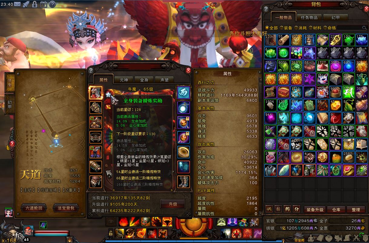 【牛魔 角色等级65 QQ等级11~20级 无QQ好友 】65牛魔白骨左右耳2W6攻1565电提移速鞋胸高三四-5幻虚套40%武器元神幻虚混沌7D花旦忘尘蓝魔蛛4段海洋5段燃魂幻