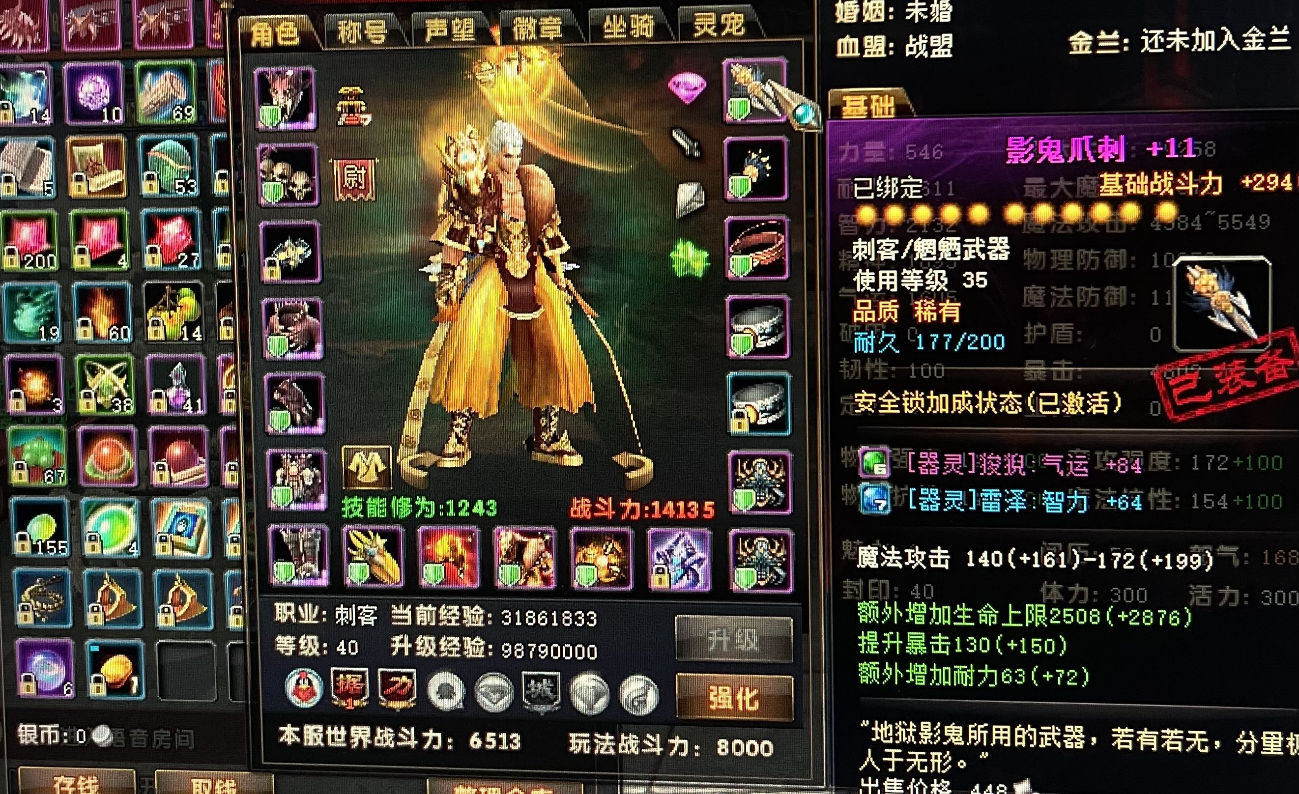 【刺客 男 角色等级40 可以二次实名 】1万4千战斗力,金票3500多,差不多可以换橙色配饰时装了,有汽运紫器灵便宜出