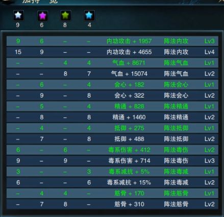 阵石满强11进度拉满细节满14个4左边3右边443毒减带5个三级角内劲毒减套