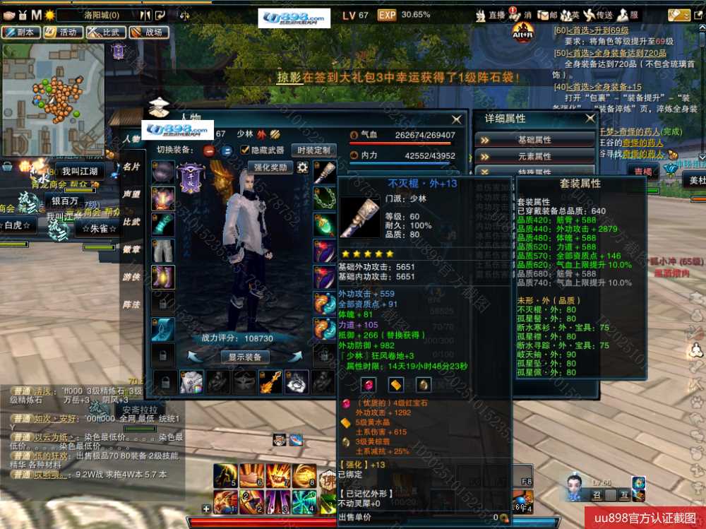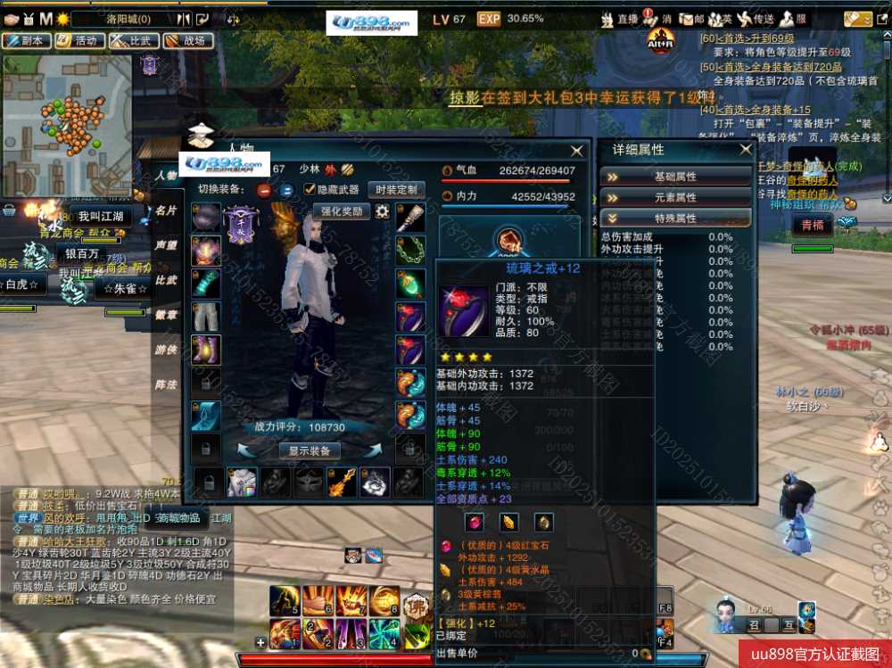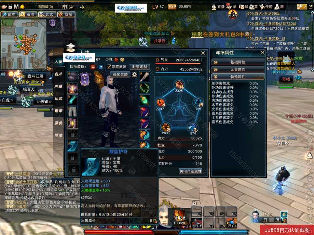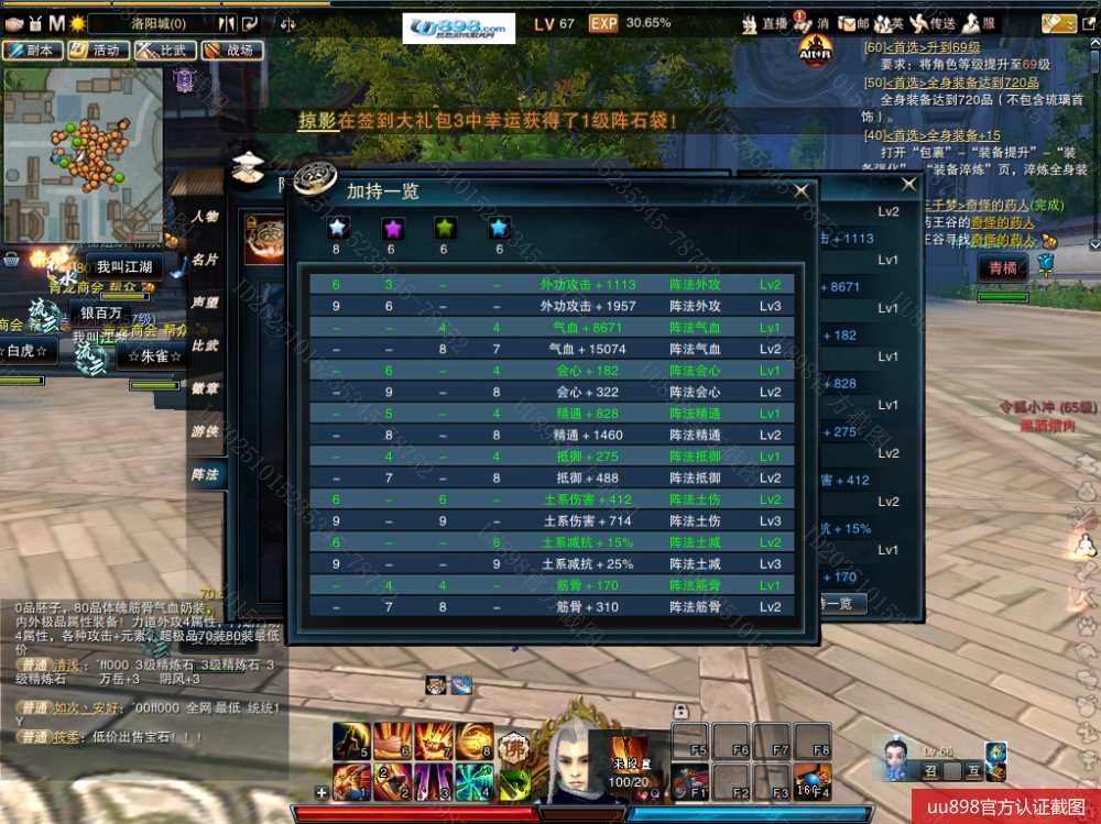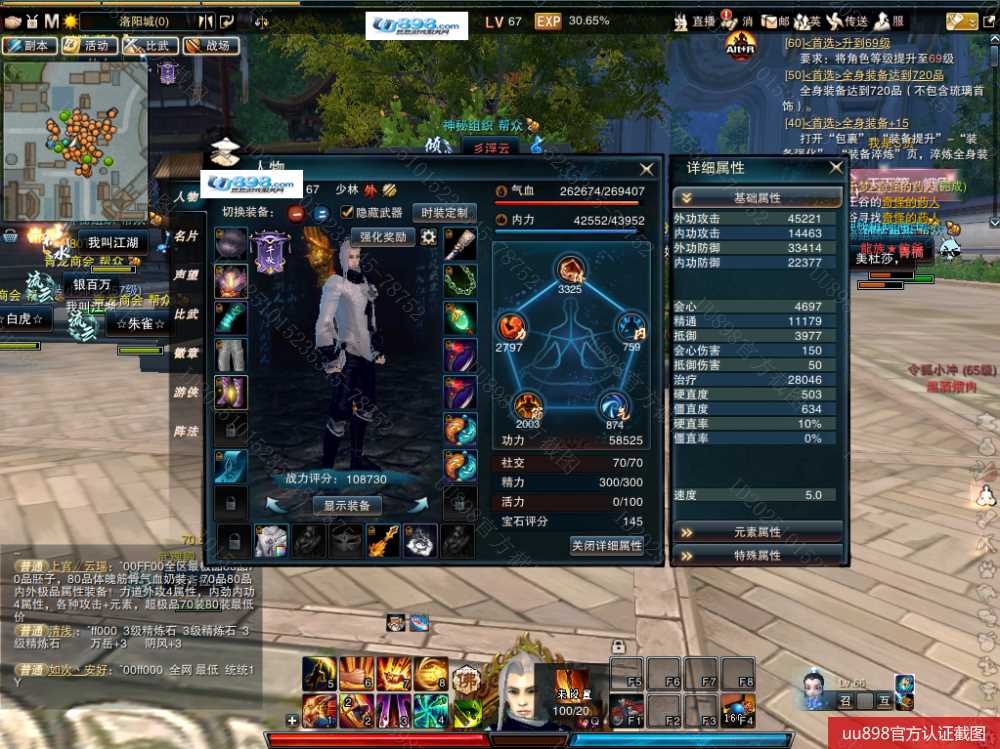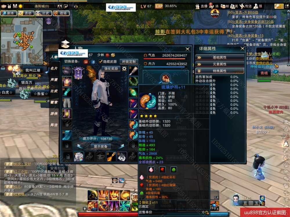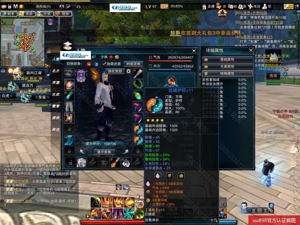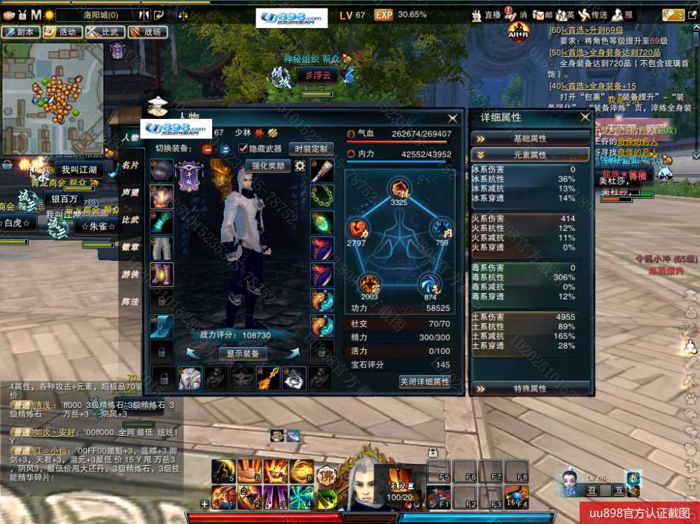 【帐号出售 少林 男 角色等级67 江湖令剩余天数35 】右边444,左边全是优质44加两颗5级土伤,8天资林小之,看图吧!!!