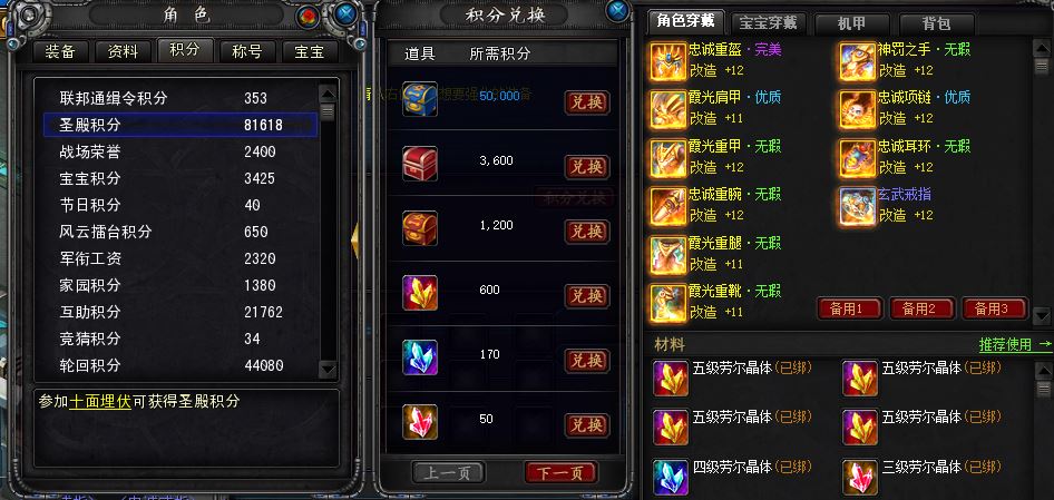 攻件全部+12,防具部份+12,仓库的劳尔加积分应该能把防具全部+12,仓库开了4页。