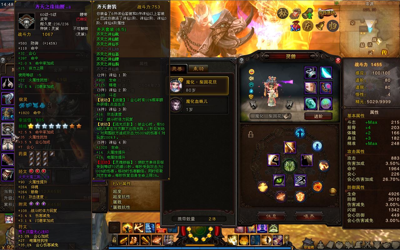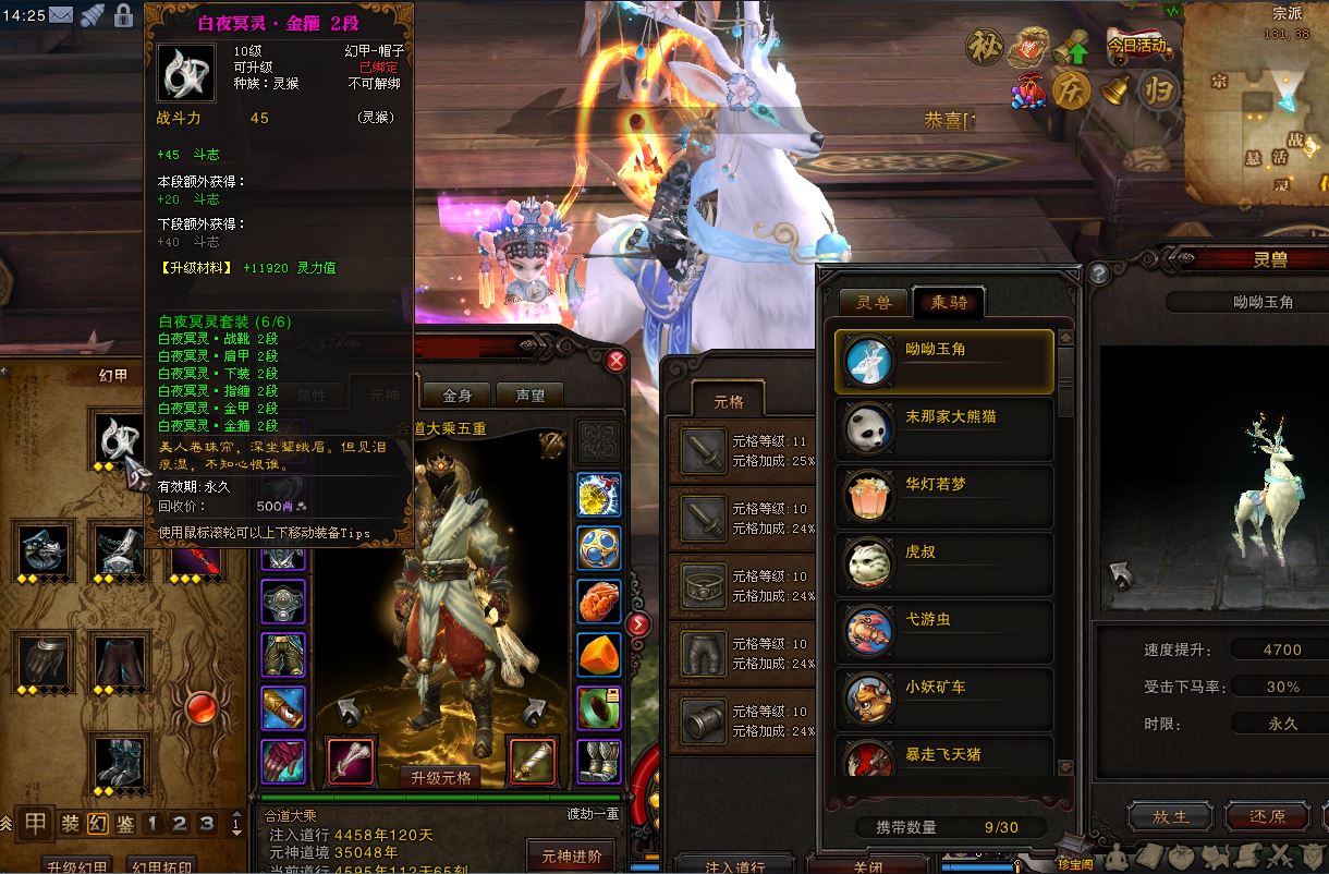 双线四区枯松涧13合1,59灵猴万攻千提高三-5套荒印,7D魔化花旦忘尘玉角大熊猫坐骑,3段未来之刃2段白夜冥灵幻甲,V7有改名签到1W金票看图。