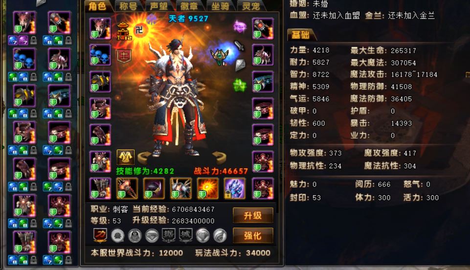 【刺客 男 角色等级53 可以二次实名 】带一套强化比成卷,两颗紫器灵,三件坐骑紫装