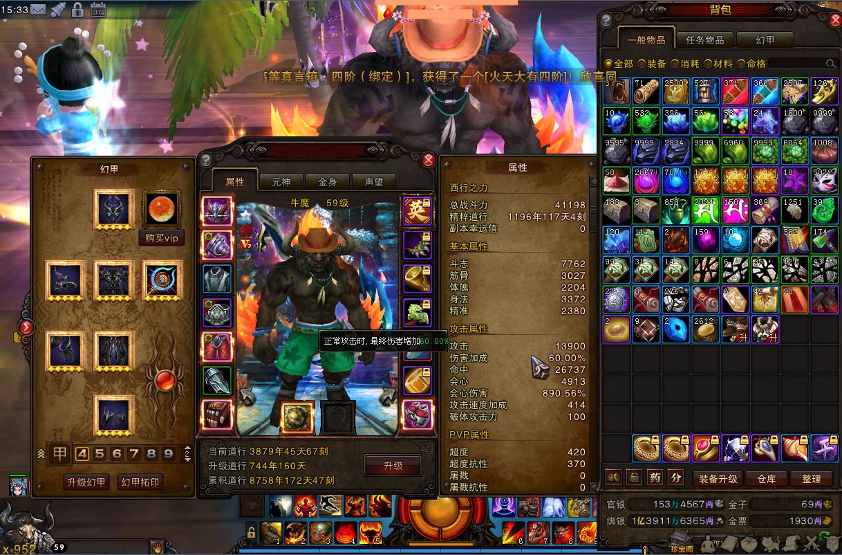 【牛魔 角色等级59 QQ等级21~40级 无QQ好友 】大背景59牛魔万3攻60%伤1100双抗1400火提移速鞋裤全身高四三30红头5段紫虹幽冥幻甲沙滩7D小龙女忘尘14兽三