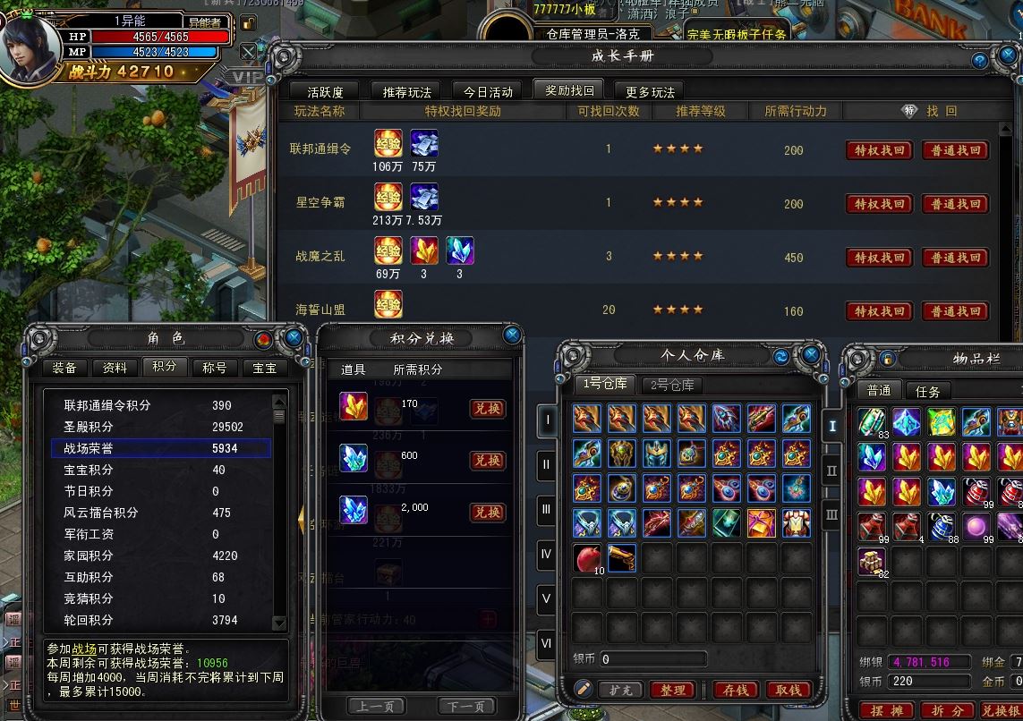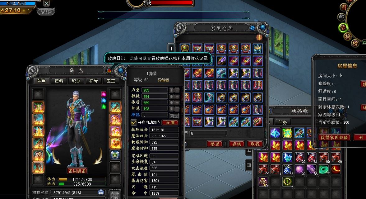 背包和家园仓库有2背包蓝装一套7等装备都是打头领的