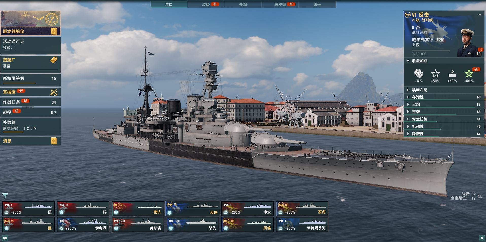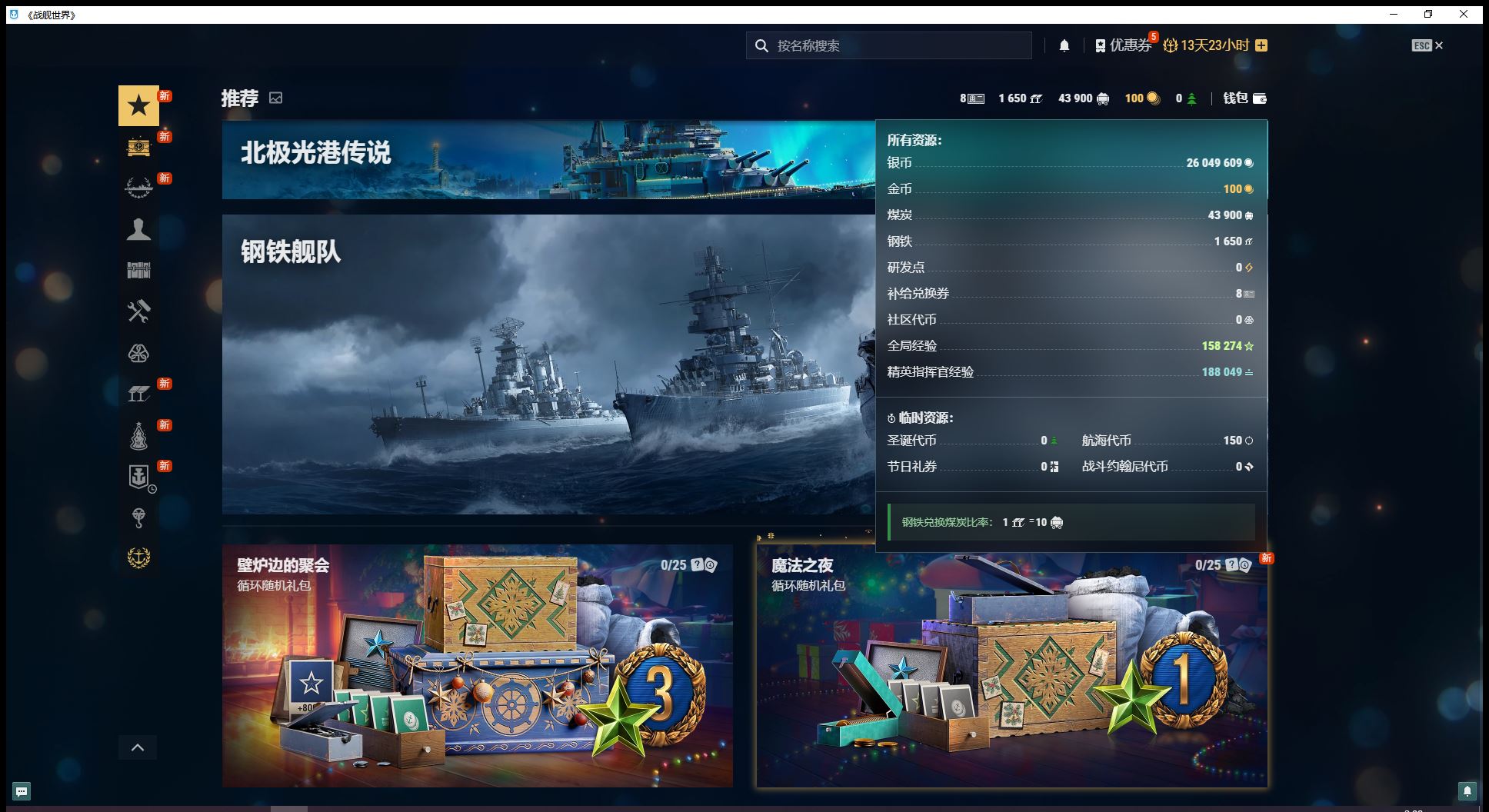 9级金币船冢虎8级金币船凤雏9级鲟8级俾斯麦怨仇2个6金反击、鳌5金猎人煤炭4.3万、钢铁1600、全局15.8万