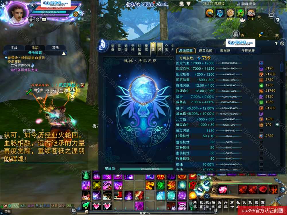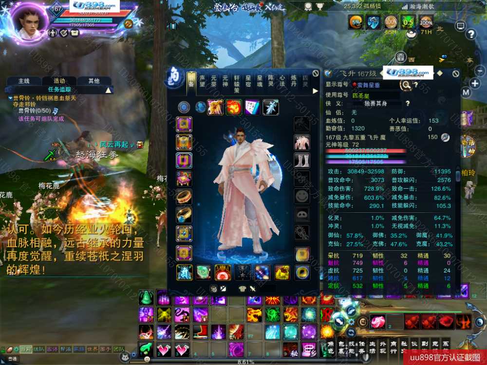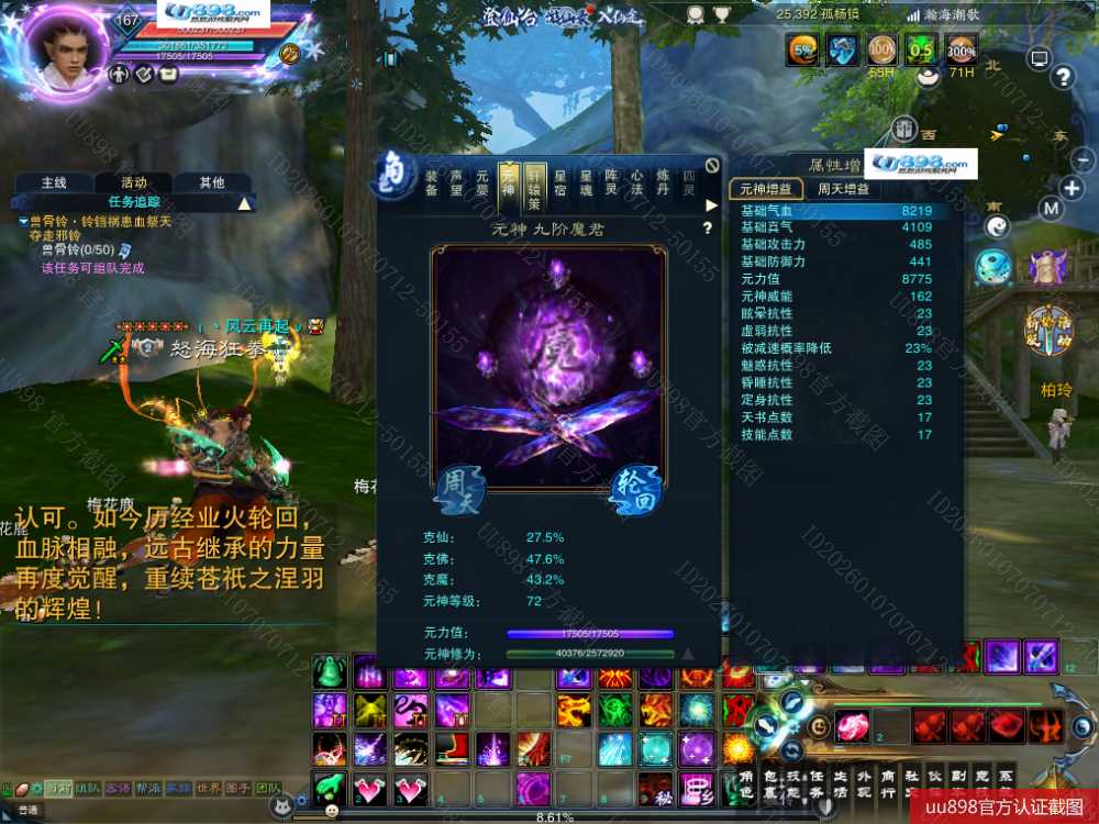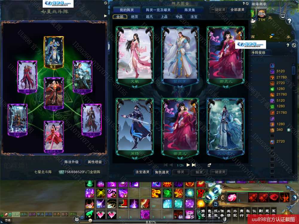 7阵都12阶,九旒坤10武器,昭武11鞋子,天罡11衣服,11的修武帽子,万法1星,大乘战罡,双减免定制元婴